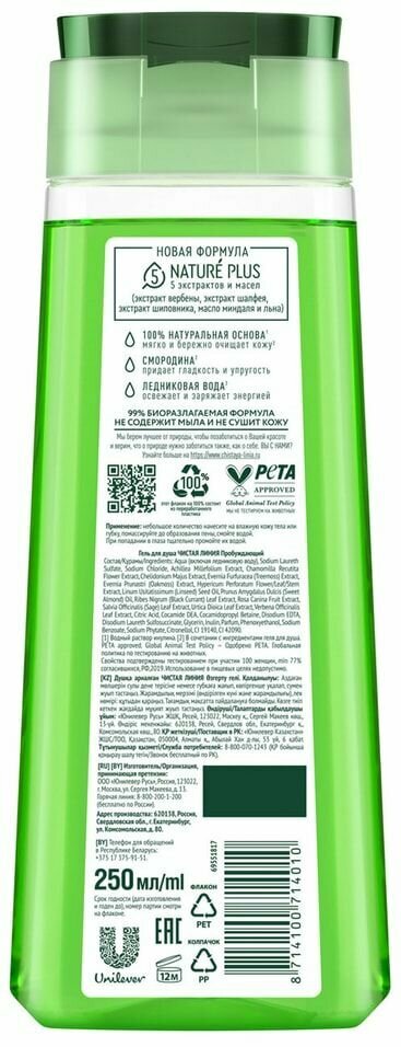 Чистая Линия гель для душа пробуждающий на 100% натуральной основе со смородиной и ледниковой водой 250 мл