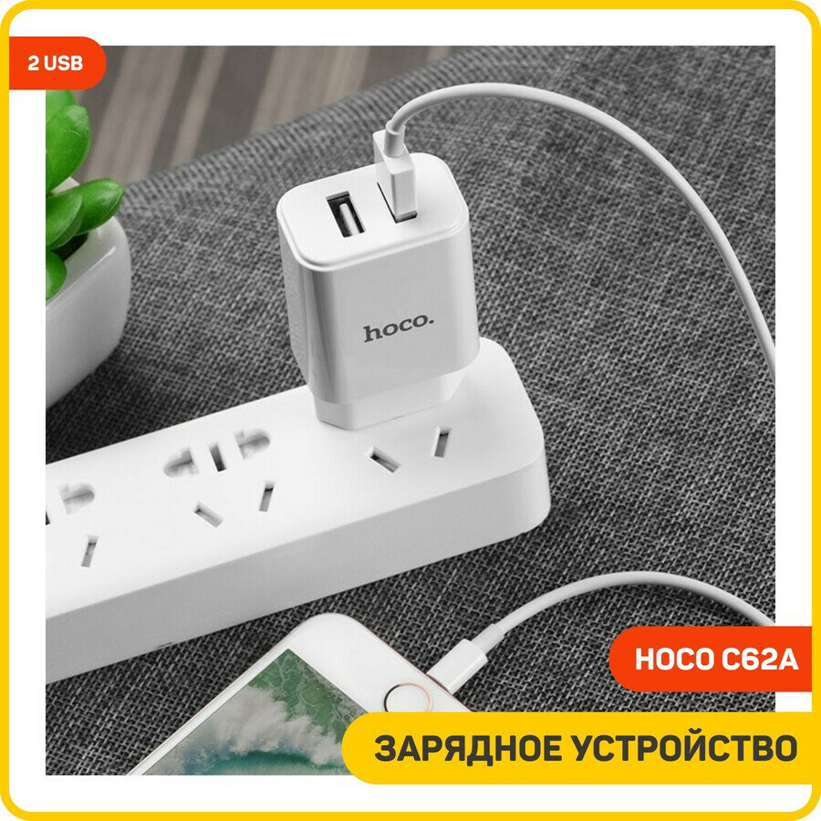 Сетевое зарядное устройство (СЗУ) Hoco C62A (2 USB) + кабель Lightning, 2.1 А, белый