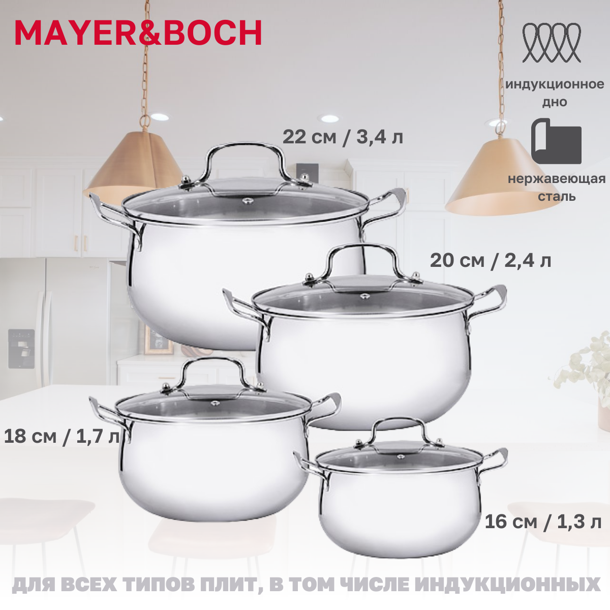 Набор посуды 8пр 1,3+1,7+2,4+3,4л Mayer&Boch (х4) (29351) .