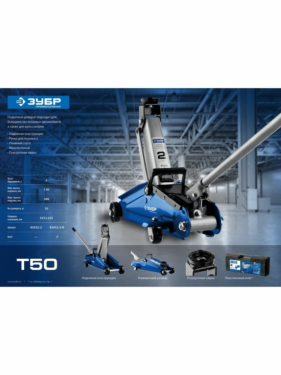 ЗУБР Т-50, 2 т, 130 - 380 мм, подкатной домкрат с увеличенным подъемом, Профессионал (43052-2)