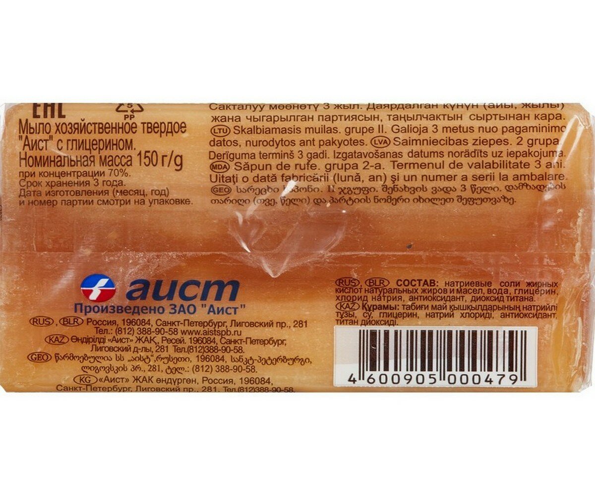 Не вонючее. --- Использую для изготовления стирального порошка для новорожденного. Тру на мелкой терке мыло и добавляю соду в пропорции 1:2 (мыло:сода). Получается безвредный порошок. Таким же составом, но с добавлением ароматического масла стираю взрослую одежду. Этот порошок засыпать прямо в барабан. --- Состав: натриевые соли жирных кислот натуральных жиров и масел, вода, глицерин, хлорид натрия, антиоксидант, диоксид титана. --- Недостатки: в составе синтетический компонент диоксид титана. Лучше было без него. --- Производитель: ЗАО "Аист", г.Санкт-Петербург |