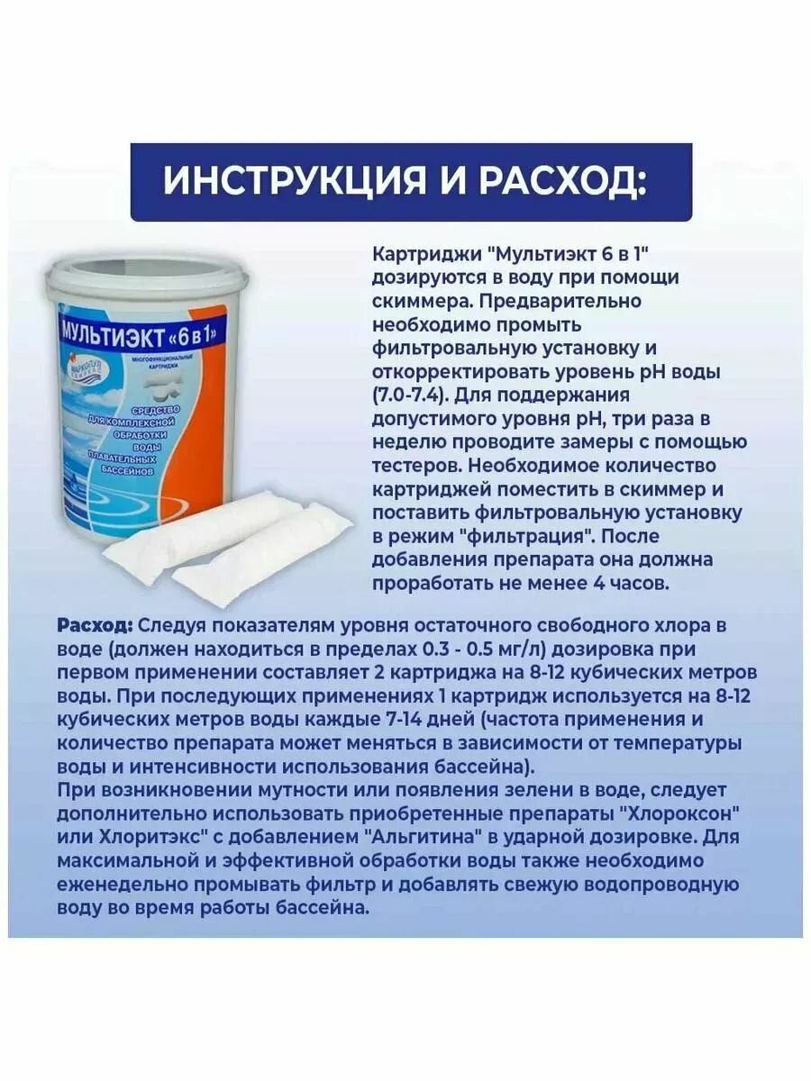 Мультиэкт 6 в 1 (0,8 кг): Комплексное средство в картриджах для обеззараживания и очистки воды бассейна. Маркопул Кемиклс