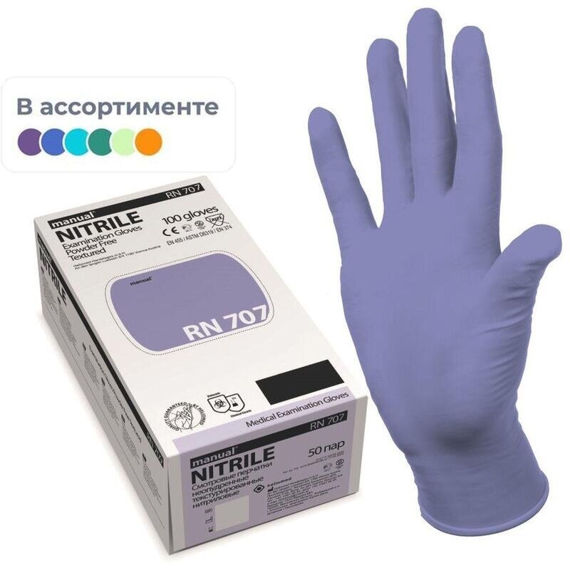 Перчатки медицинские смотровые Manual RN 707 нитриловые неопудренные в ассортименте (размер L, 100 штук/50 пар в упаковке)