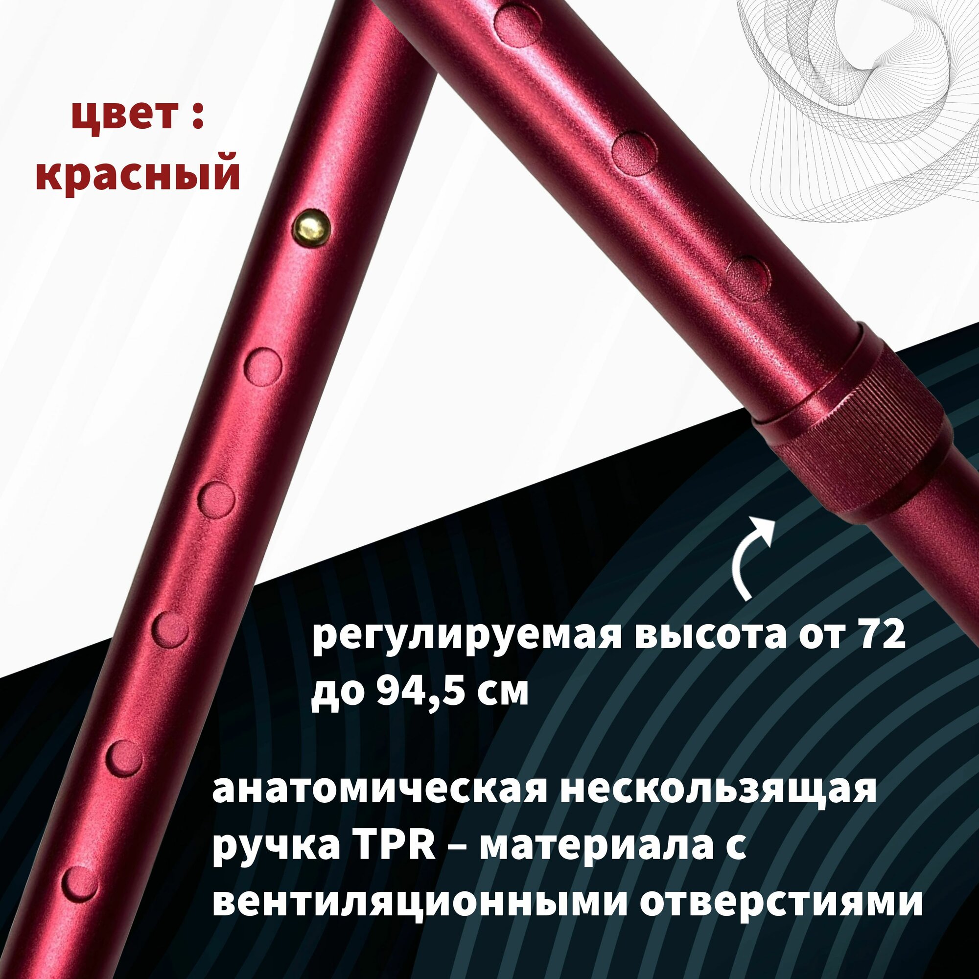 Трость телескопическая Trives серии NOVA с анатомической ручкой и ремешком, цвет красный