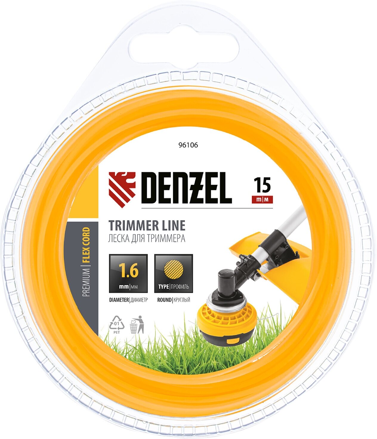DENZEL Леска для триммера, круглая 1,6 мм х 15 м, блистер Flex cord Denzel, ( 96106 )