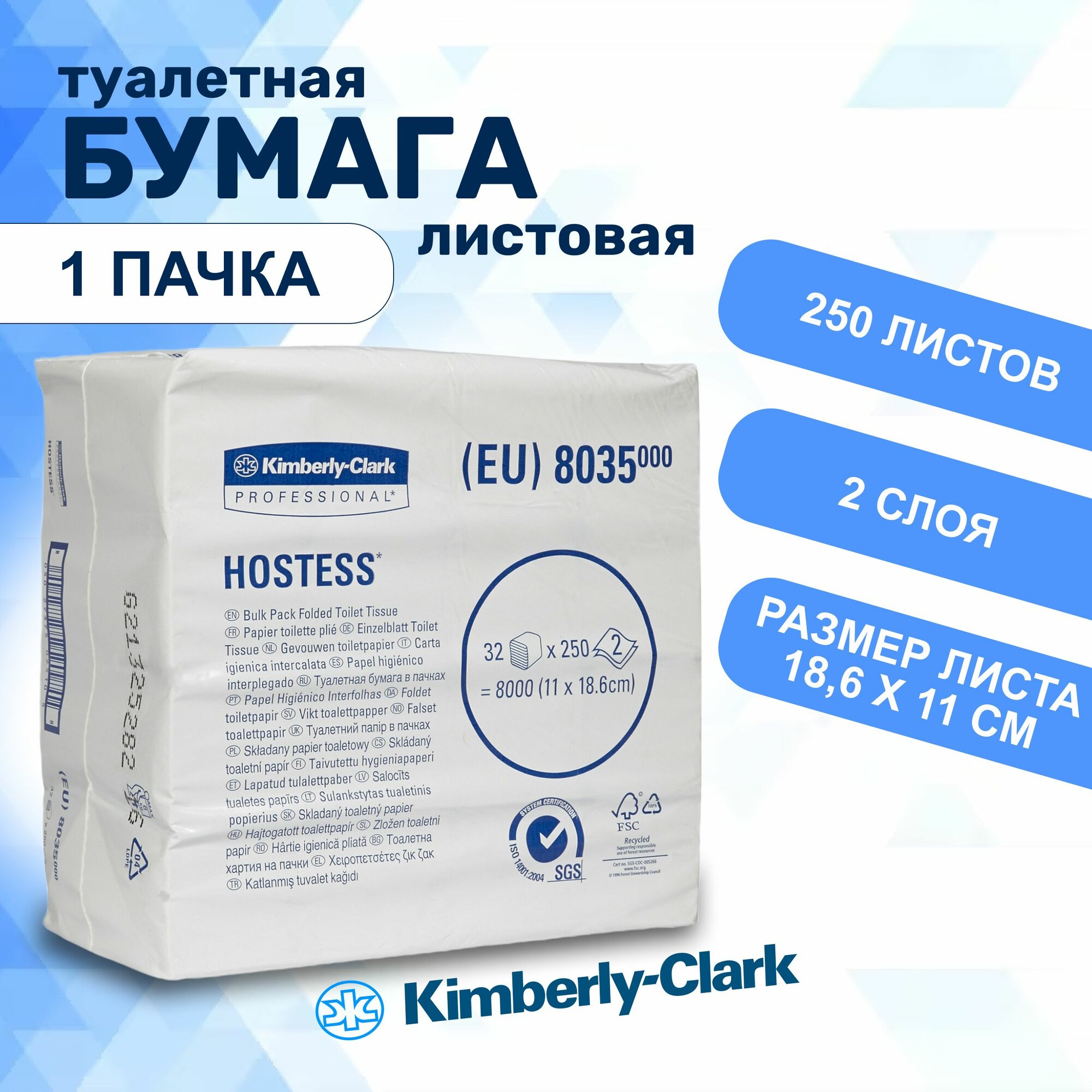 Купить Туалетная бумага листовая Kimberly-Clark Hostess 8035, 250 листов, 2 слоя, 1 пачка