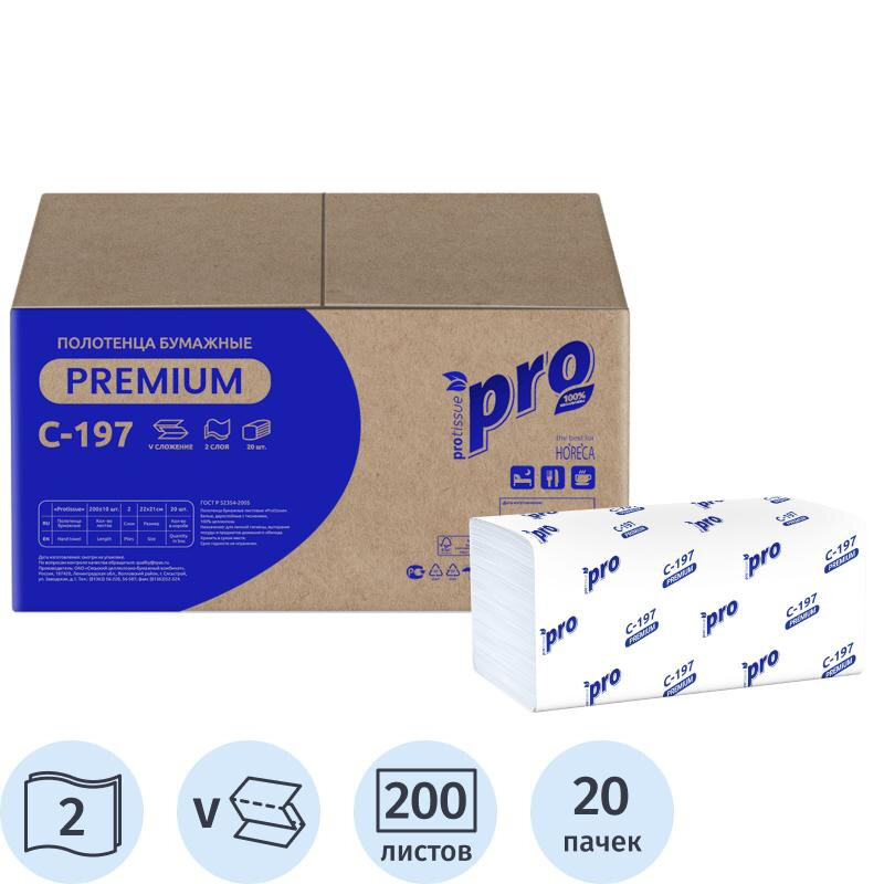 Полотенца бумажные 200 шт., PROtissue (H3) PREMIUM, 2-слойные, белые, комплект 20 пачек, 22х21 см, V-сложение, С197, C197