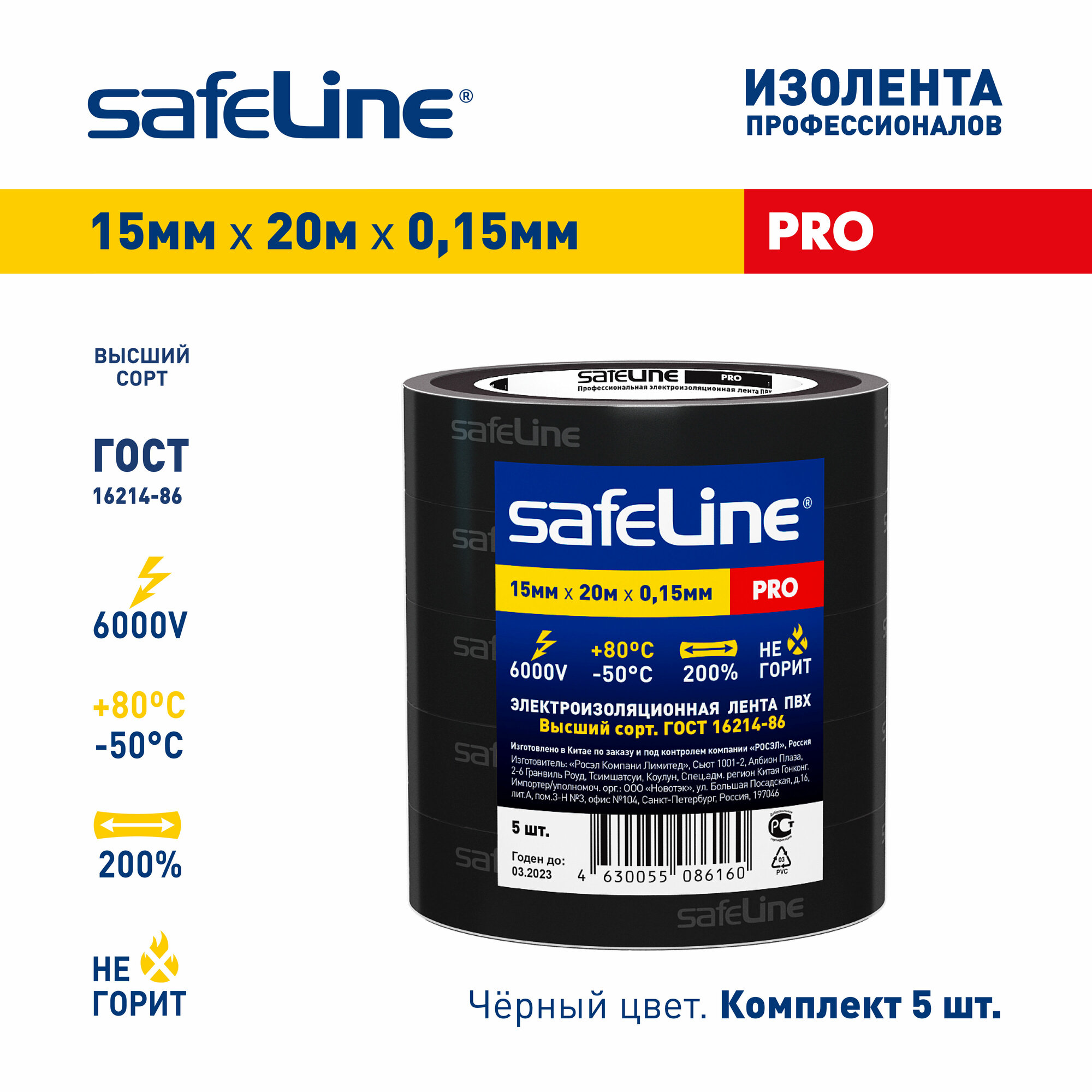 Изолента SAFELINE PRO 15/20, 1 шт., черный