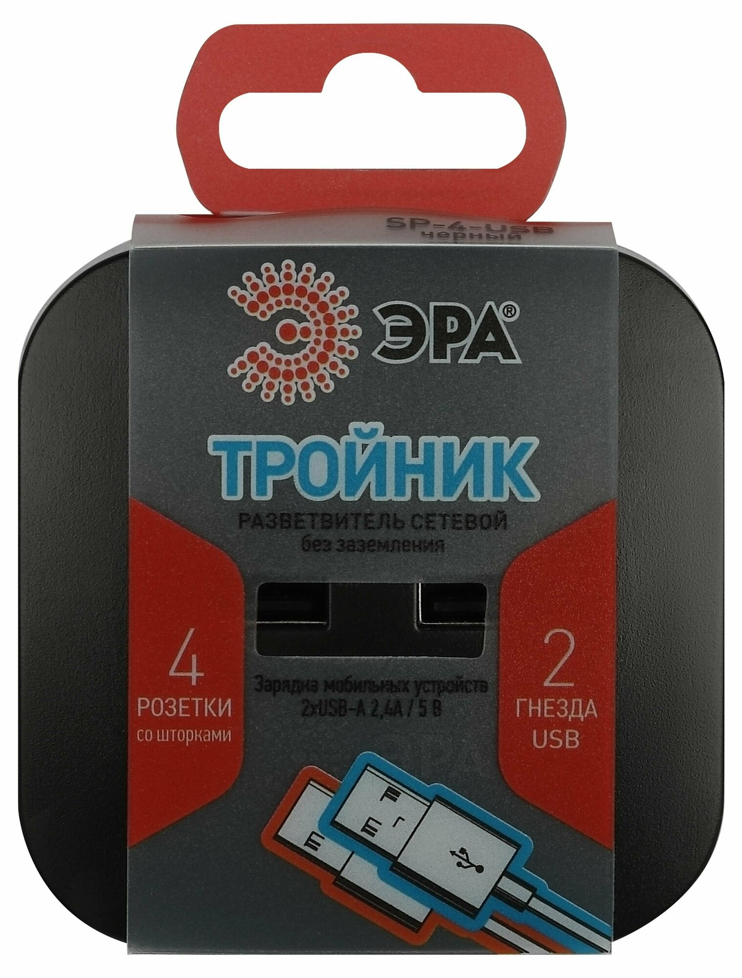 Разветвитель электрический SP-4-USB-B на 4 розетки 220В+ 2xUSB 2400мА без заземл 10А черн. Эра Б0049536