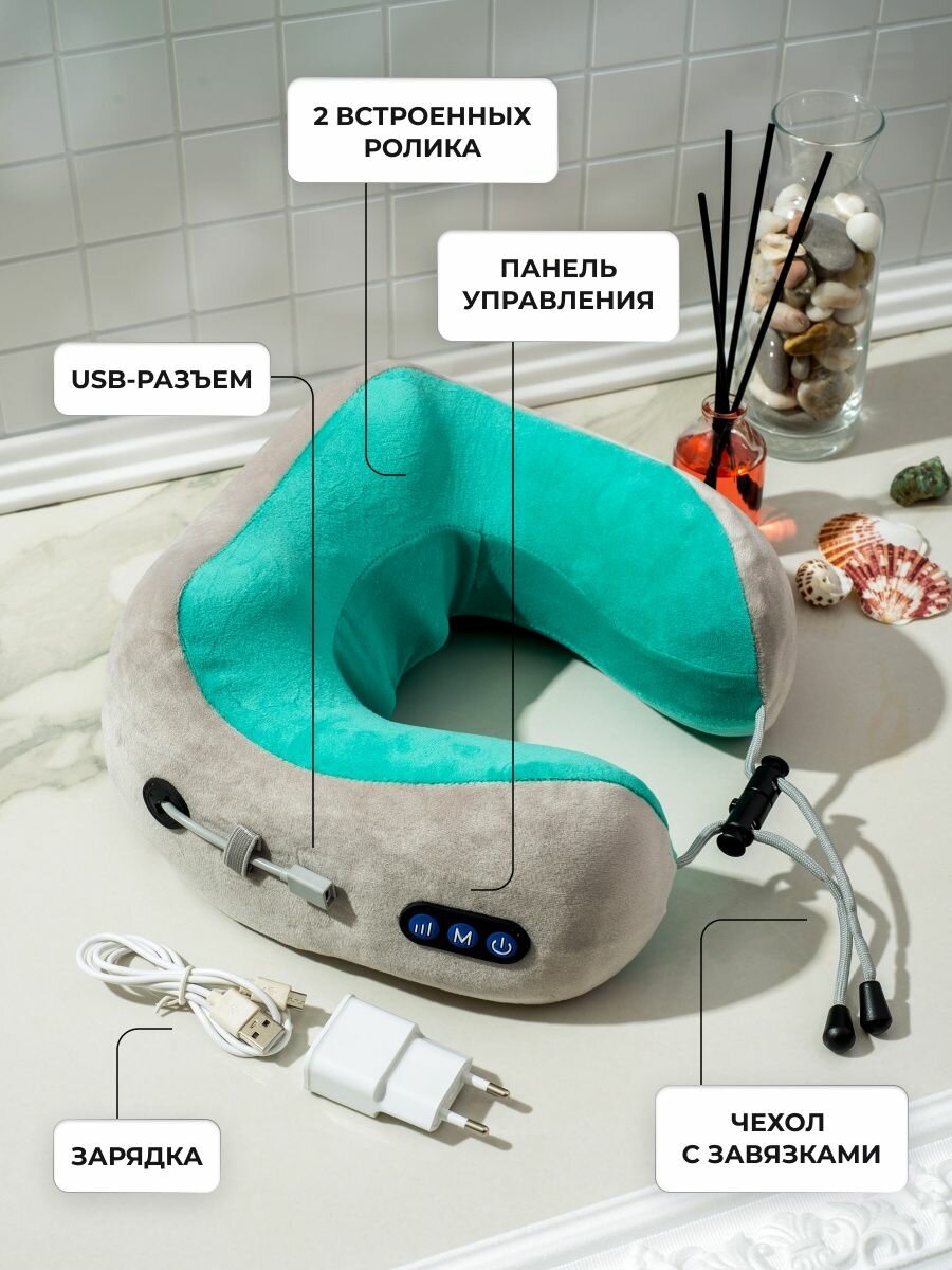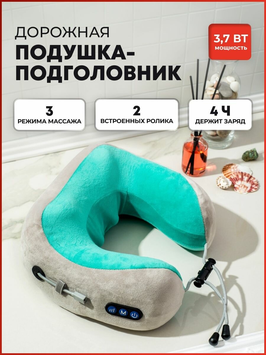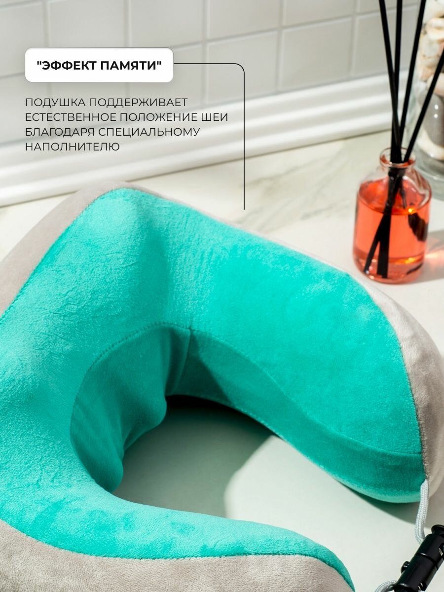 Массажная подушка-подголовник для шеи с завязками, BRADEX, дорожная, серо-зелёная