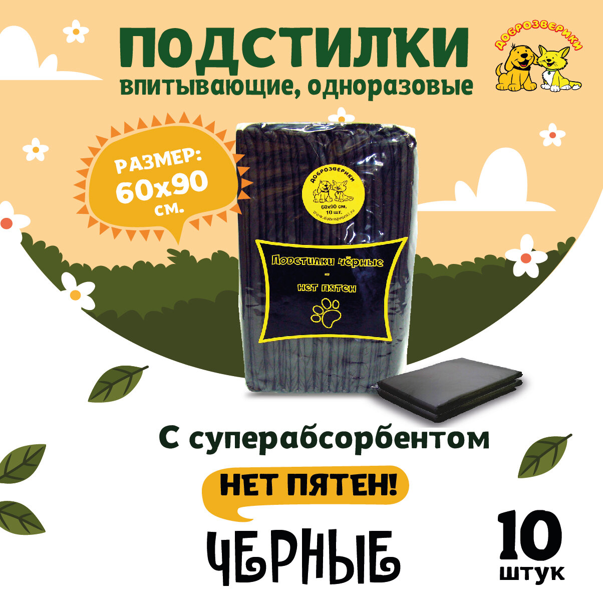 Доброзверики подстилки впитывающие для животных с суперабсорбентом 60х90 см, 10 шт, черные