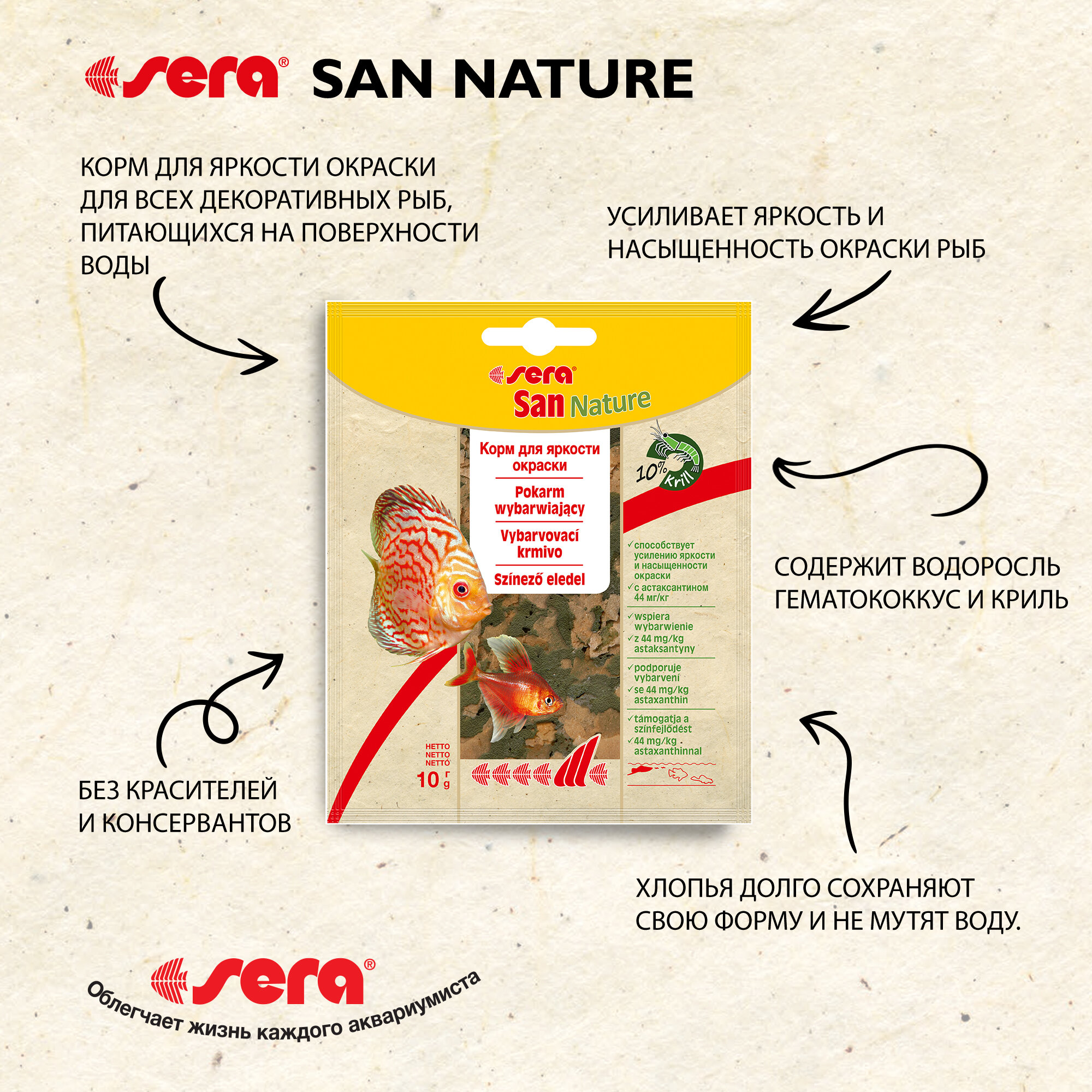 SERA, Корм для всех видов рыб, для яркости окраски, в хлопьях "San Nature", 10г, 1 пакетик, S0242