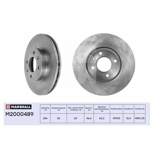 Тормозной диск передний Marshall M2000489 256x22 для Kia Rio, Hyundai Accent
