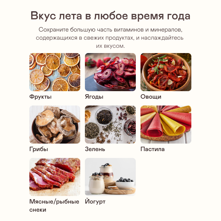 1. В целом сушилка сделана очень качественно, ничего за это время не разломалось 2. Пробовали сушить много всего, и яблоки, и бананы, и киви, и дыню. По качеству претензий нет, единственное иногда приходится уровни переставлять, чтобы не пересушивал 3. Пастилу не делали, но подон для неё в комплекте есть 4. У сушилки 3 уровня разбираются, поэтому можно ставить высокие банки с йогуртом на сушку 5. Места в ней достаточно много, чтобы все продукты разложить |