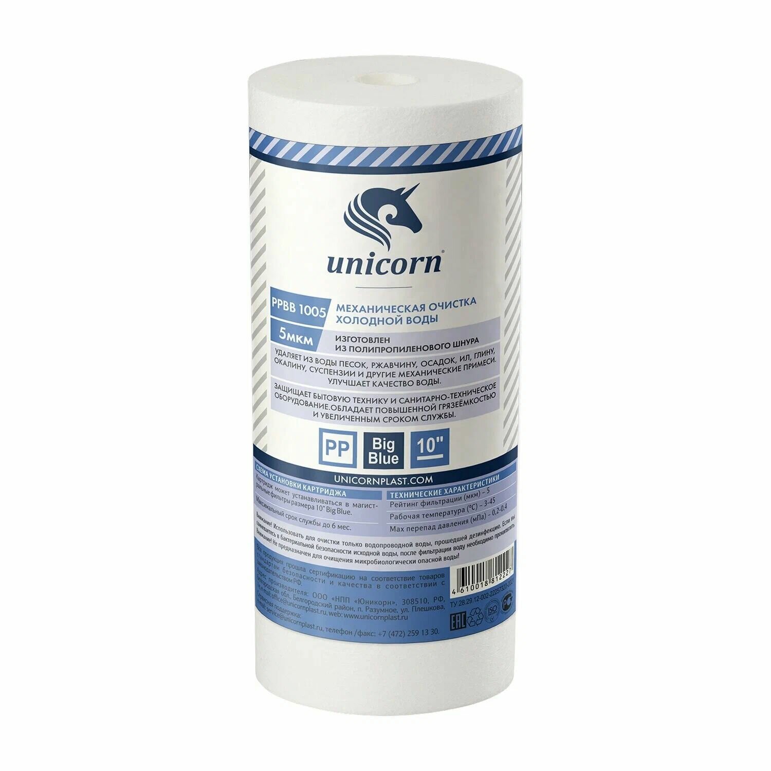 Картридж для фильтра воды механическая очистка из полипропиленового шнура для холодной воды типоразмер 10"ВВ (Big Blue) фильтрация 10 микрон Unicorn PPBB1010 5 штук