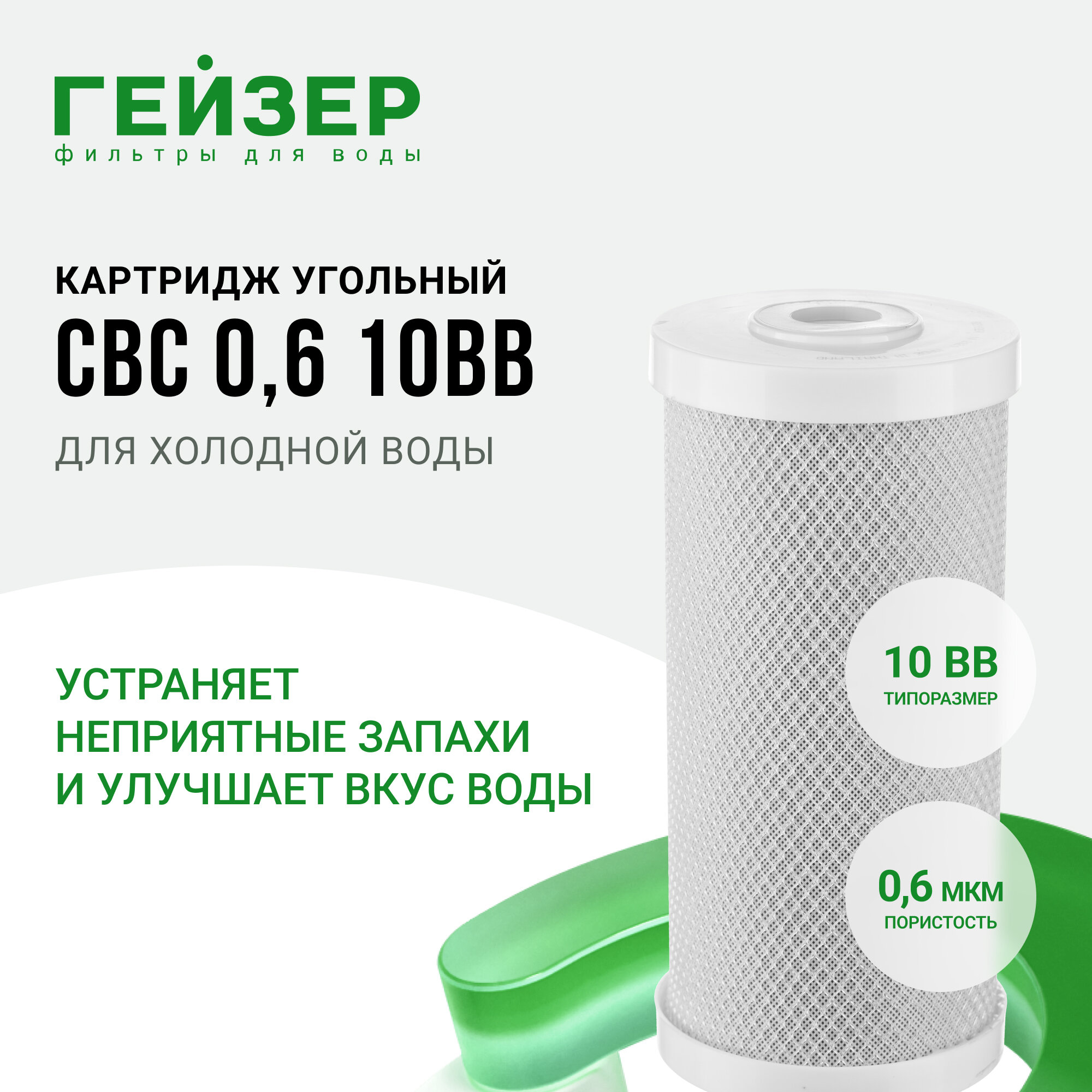 Картридж Гейзер CBC 0.6 - 10BB для магистральных фильтров из кокосового активированного угля для кондиционирования воды и глубокой очистки воды от хлора, органических и хлорорганических соединений