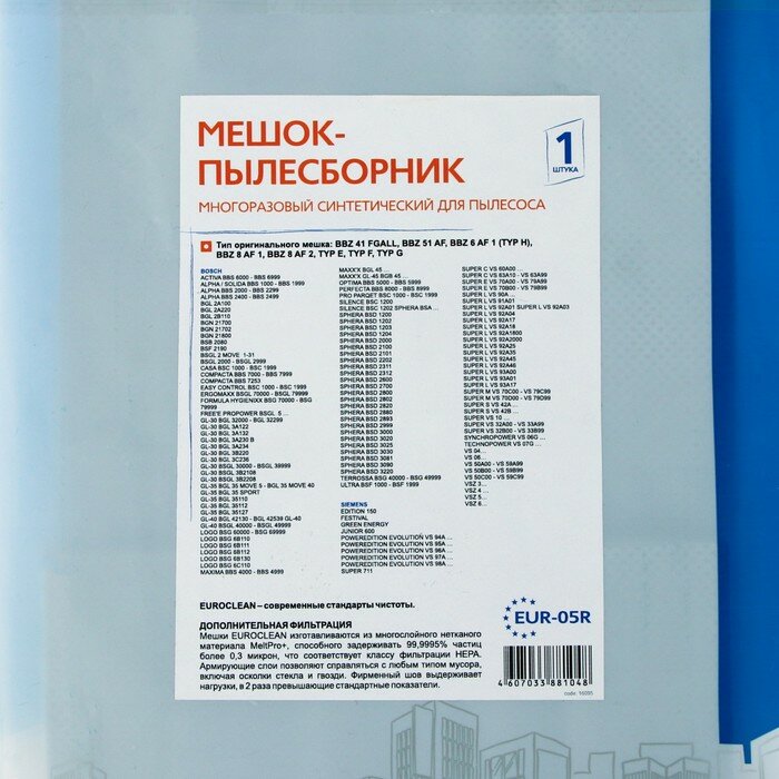 Мешок-пылесборник EUR-05R Euroclean многоразовый для пылесоса интересное: