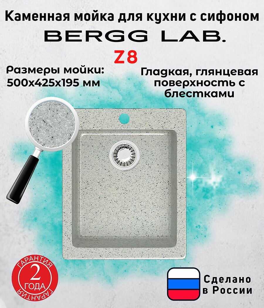 Мойка для кухни/Раковина для кухни BERGG lab., глянцевая с блестками Z8 светло-серый (50х42,5х19,5 см)