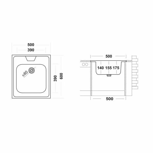 Мойка кухонная накладная Стандарт 500х600х155мм квадратная, нерж.сталь