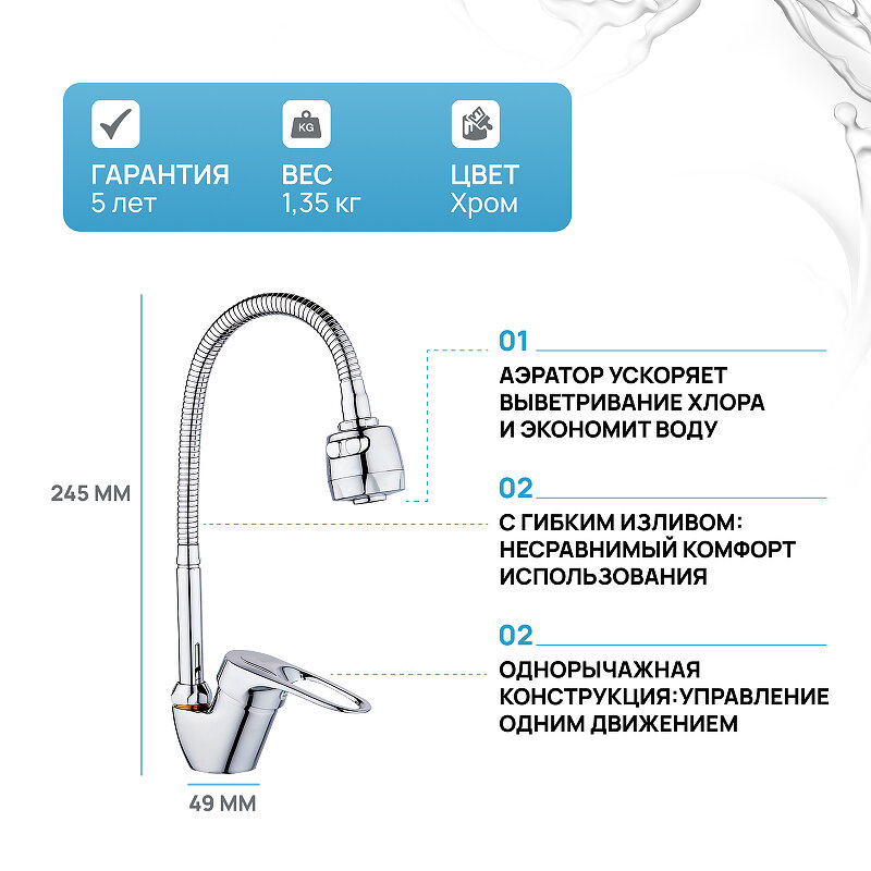 Ростовская Мануфактура Сантехники Смеситель для кухни RMS SL55-016F, однорычажный, высокий гибкий излив, хром