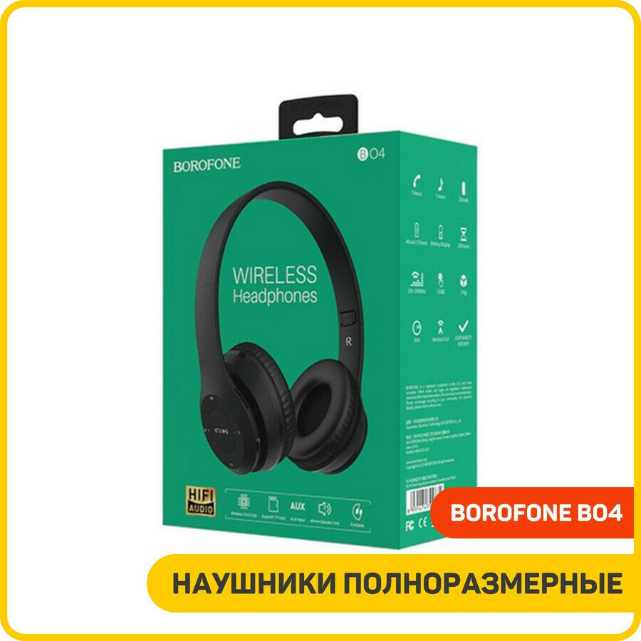 Наушники Borofone BO4 Charming rhyme, беспроводные, накладные, Bt5.0, Aux, 200 мАч, чёрные Borofone