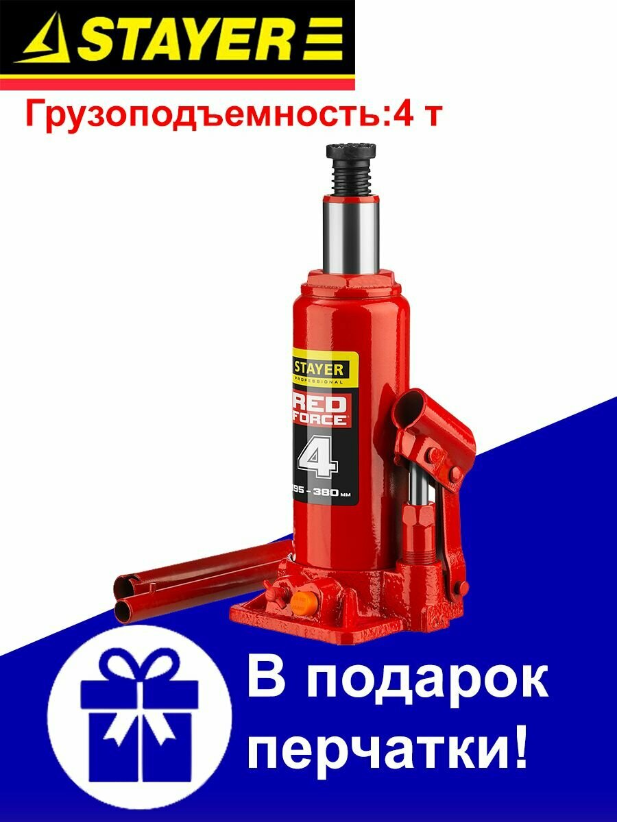 Домкрат STAYER 43160-4_z01 гидравлический бутылочный red force 4т 195-380мм