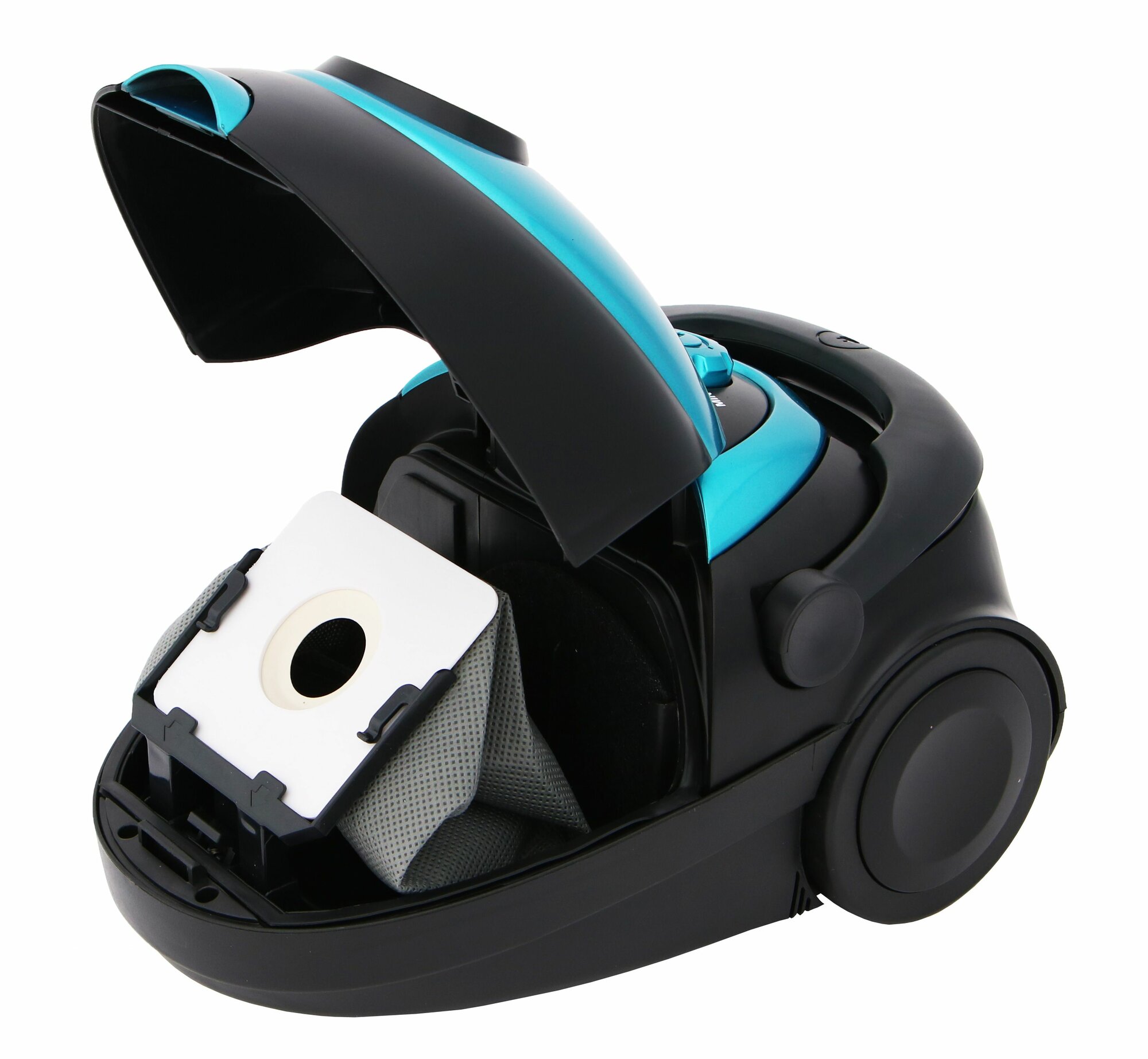Пылесос для дома Willmark VC-2650DBM, 2000Вт, с фильтром тонкой очистки, мешком 3 л, индикатором заполнения пылесборника, черный/голубой