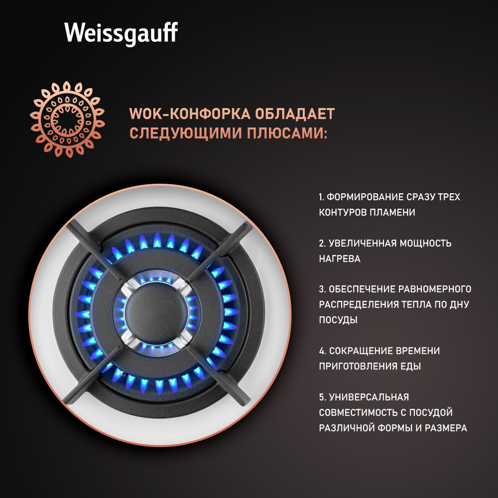 Купить Варочная панель Weissgauff HGG 640 WGW WOK-конфорка, 3 года гарантии, автоматический электроподжиг, Рукоятки Hi-Tech, газ-контроль