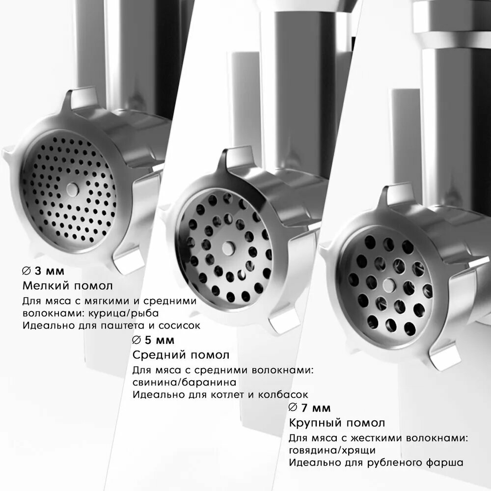 Понравилось, что в комплекте есть диски с разными диаметрами отверстий. И возможность доукомплектовать овощерезкой, что для меня важно т.к я люблю замораживать на зиму тертые овощи. Работает с мясом очень быстро за счет мощного двигателя. Пользуюсь более года, сбоев в работе не было