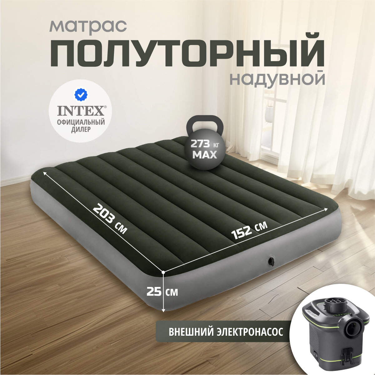 Матрас надувной Intex, 203х152х25 см, 64779, насос внешний, электрический, флокированный, 273 кг