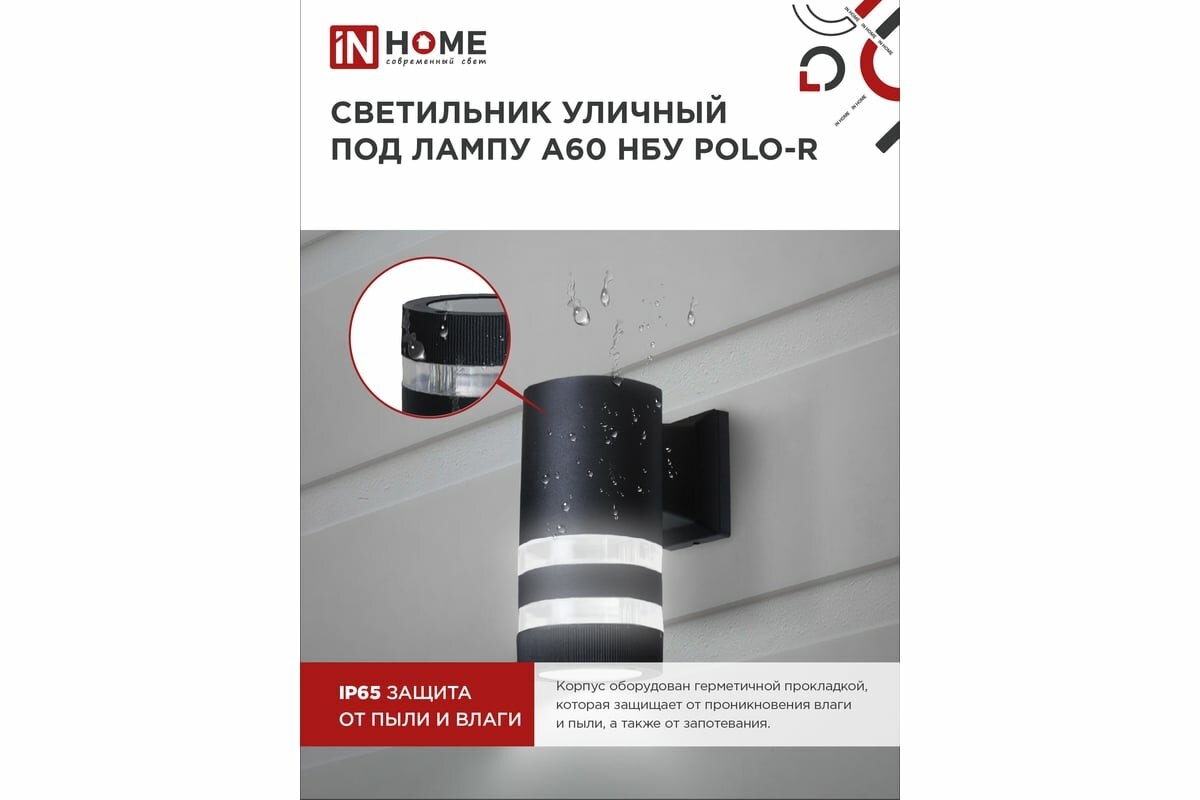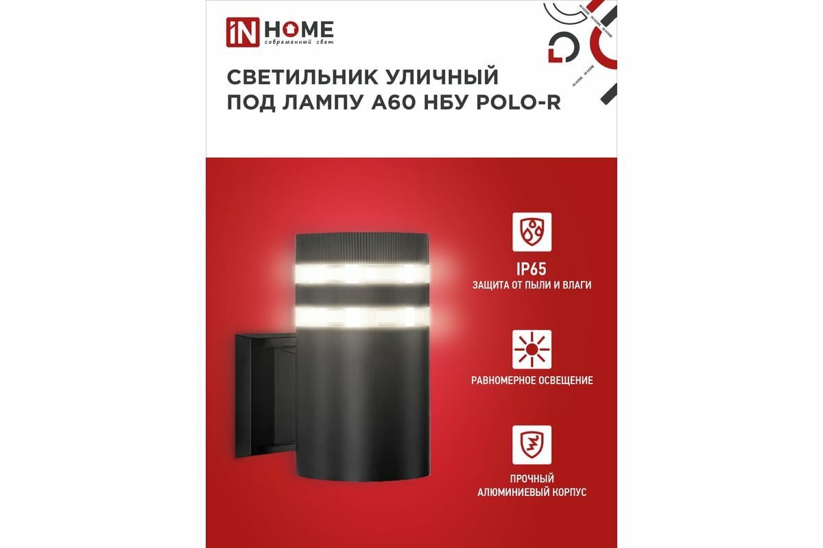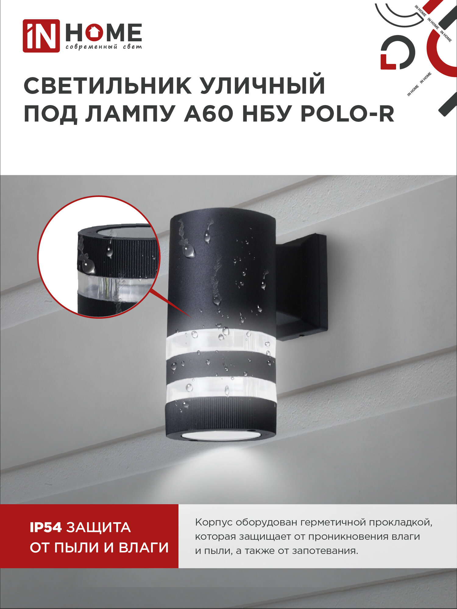 СохранитьIN HOME Светильник уличный односторонний НБУ POLO-R-1xA60-BL алюм под 1xA60 E27 черн IP54 (арт. 4690612045061) интересное: