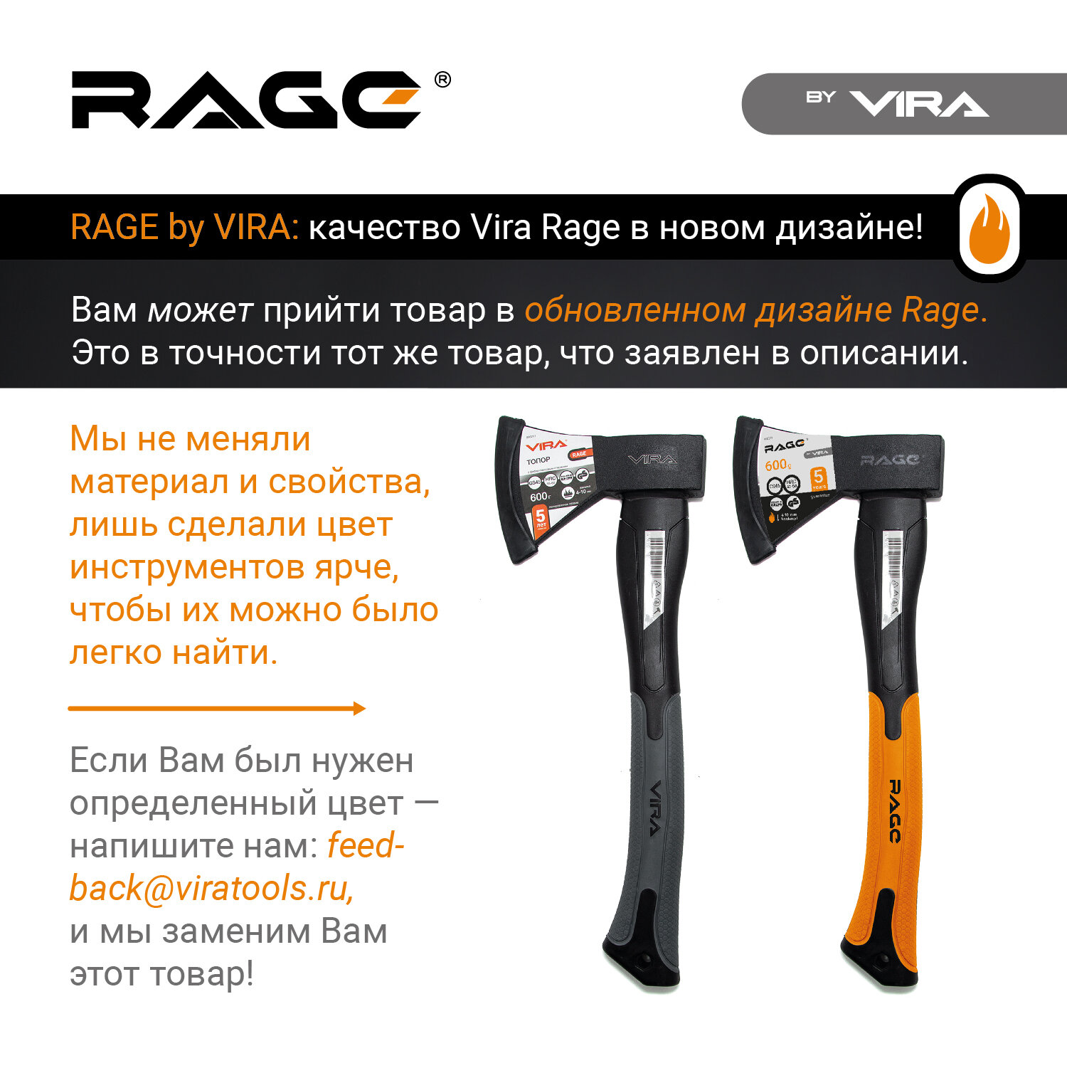Топор 800 г с фиберглассовой рукоятью RAGE by VIRA оранжевый интересное:
