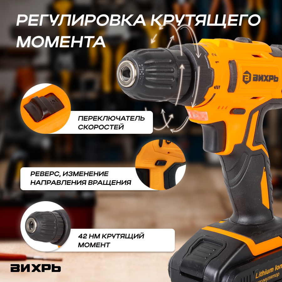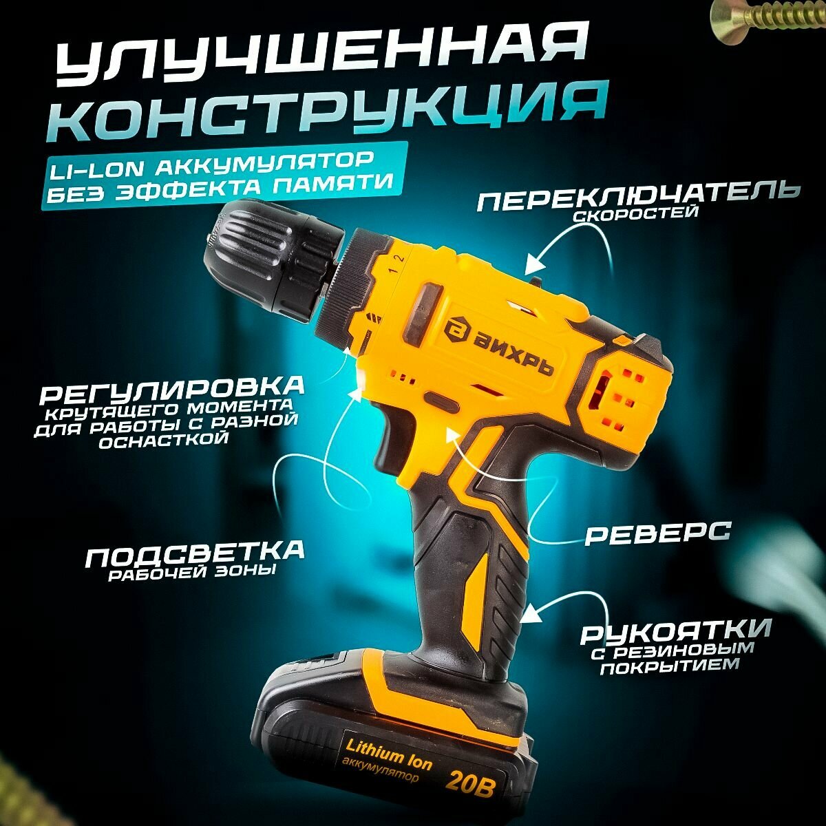 СохранитьДрель аккумуляторная Вихрь ДА-20Л-2КА 20В Li 1_5Ач 42Нм 10мм 2 аккумулятора_ кейс_ набор оснастки 65 предметов интересное: