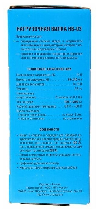 Вилка нагрузочная для проверки АКБ, 100/200 А (12В) НВ-03 (электронная) "Орион"