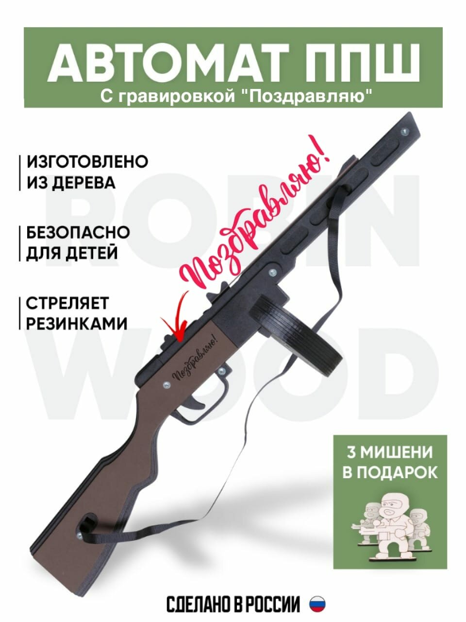 Автомат-резинкострел ППШ со съемным магазином и стрельбой очередями c надписью "с днем Победы" от ARMA. TOYS — деревянный, покрашен под настоящий