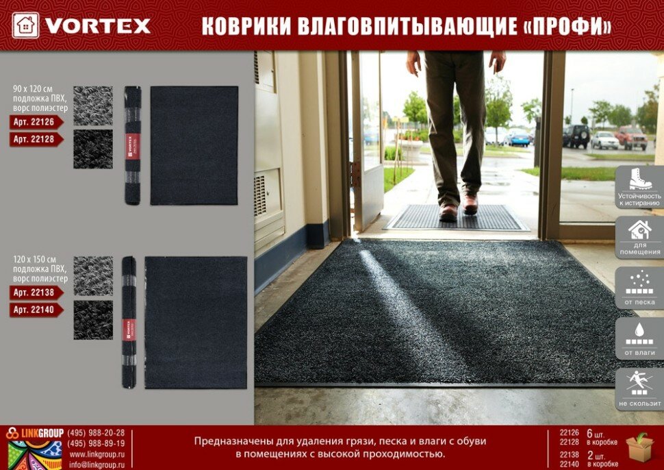 Коврик влаговпитывающий, VORTEX, профи, 120х150см, чёрный