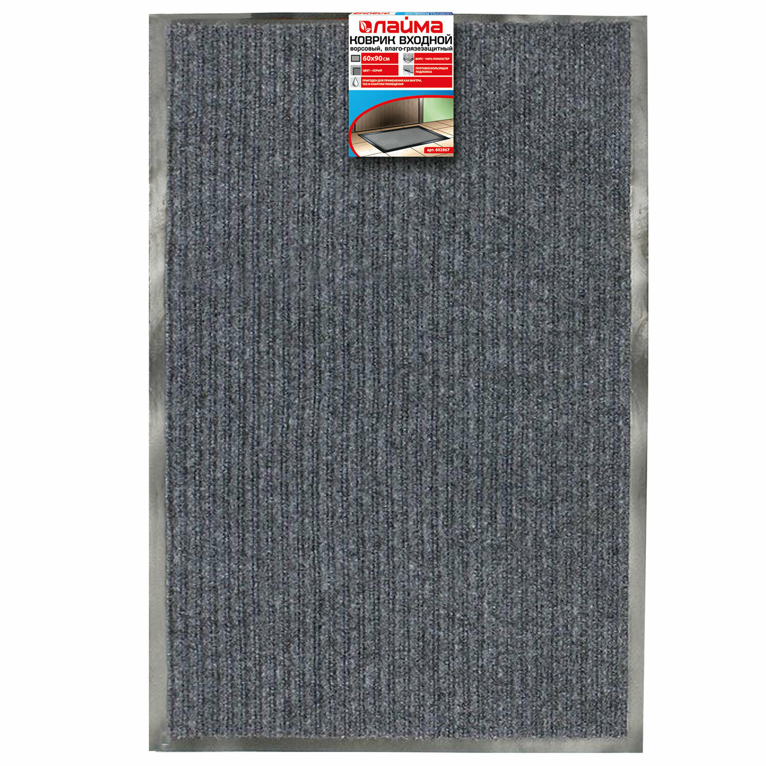 Коврик входной ворсовый влаго-грязезащитный 60х90 см, толщина 7 мм, ребристый, серый, LAIMA, 602867, 602867