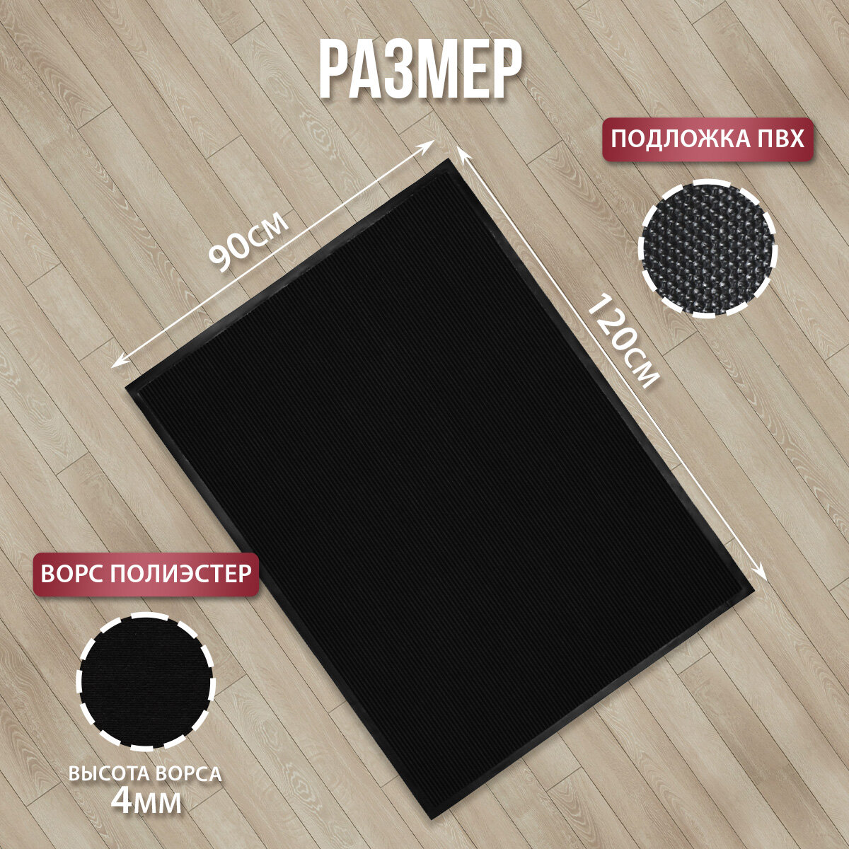 Коврик грязезащитный, черный, 90см х 120см, ребристый