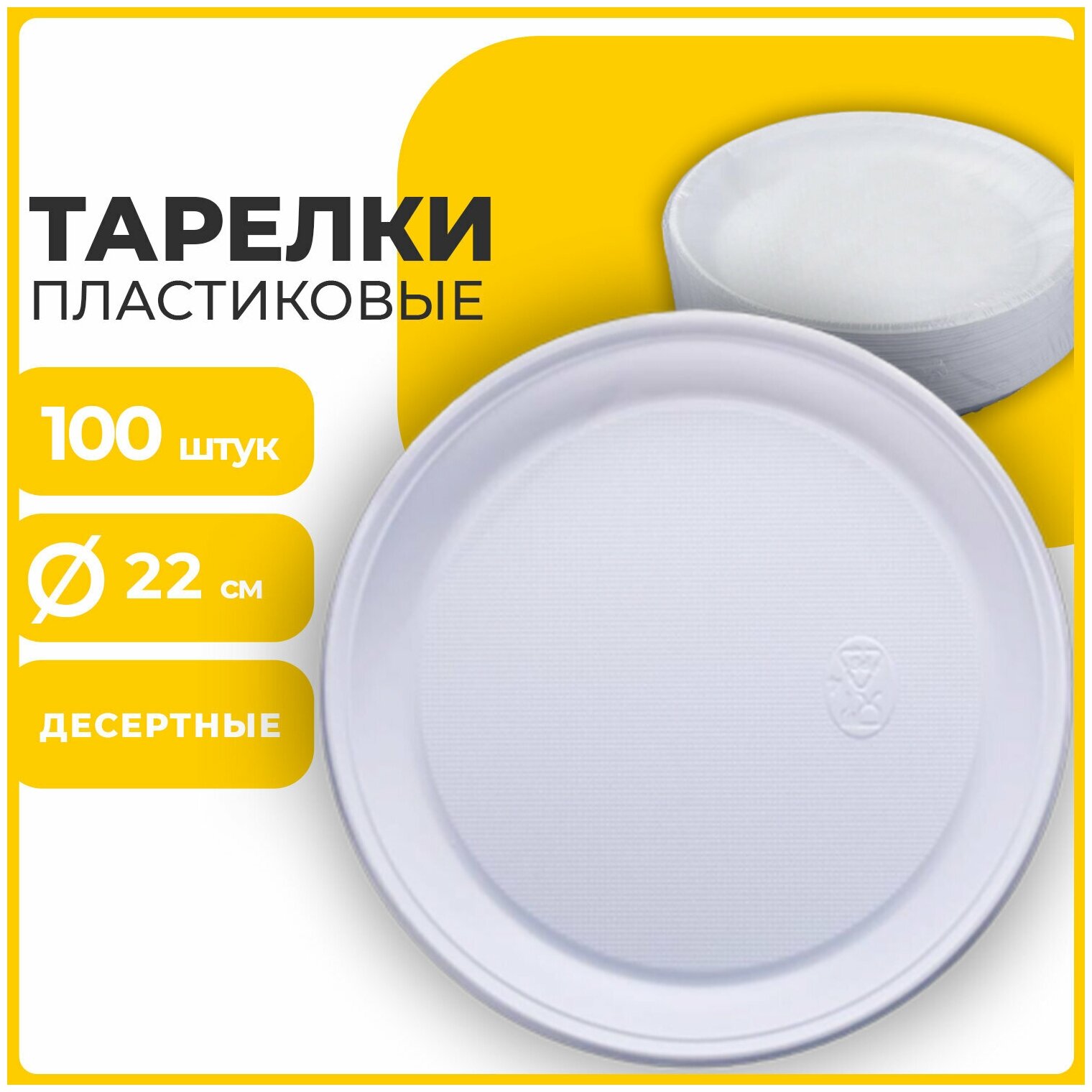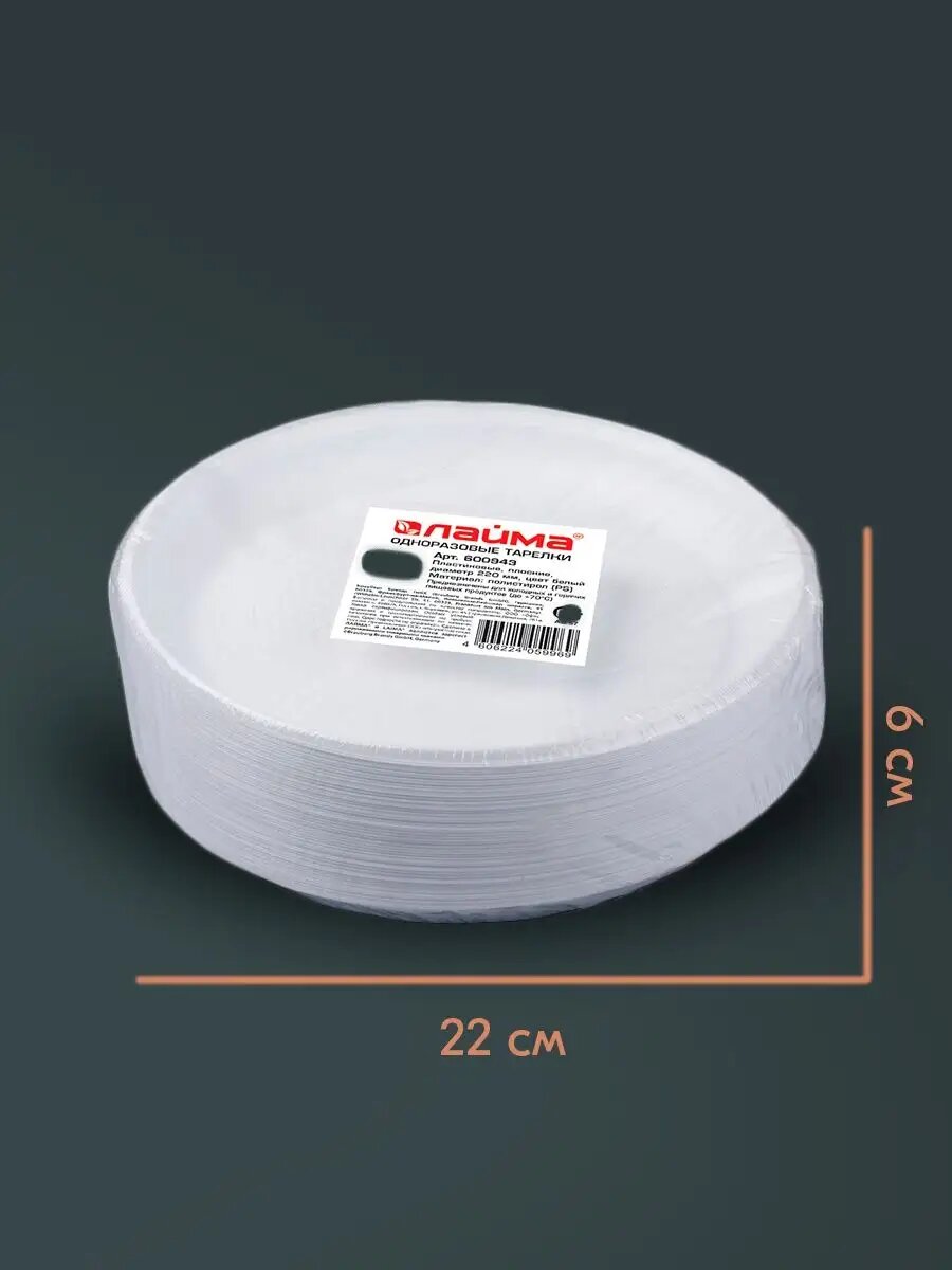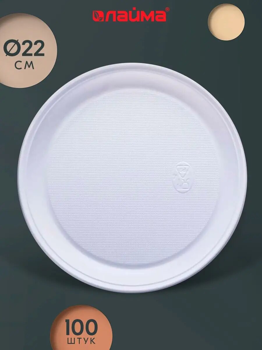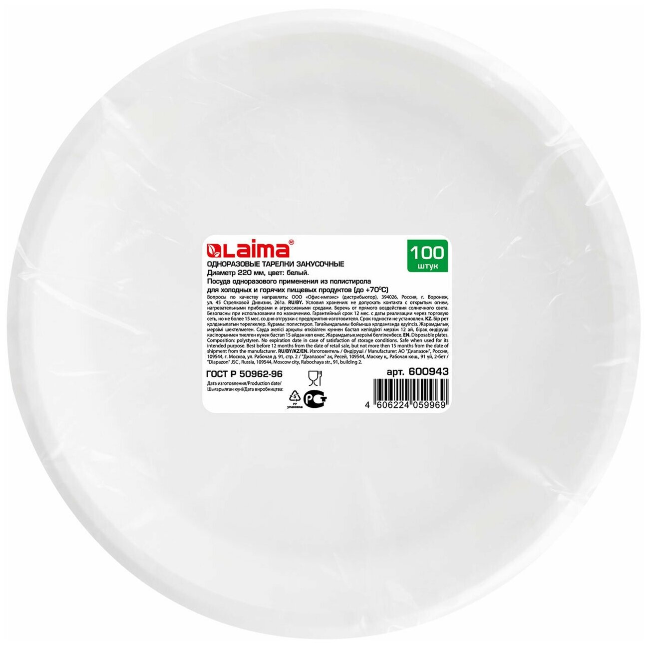 Одноразовые тарелки плоские, комплект 100 шт., пластик, d=220 мм, бюджет, белые, ПС, холодное/горячее, LAIMA, 600943 упаковка 4 шт.