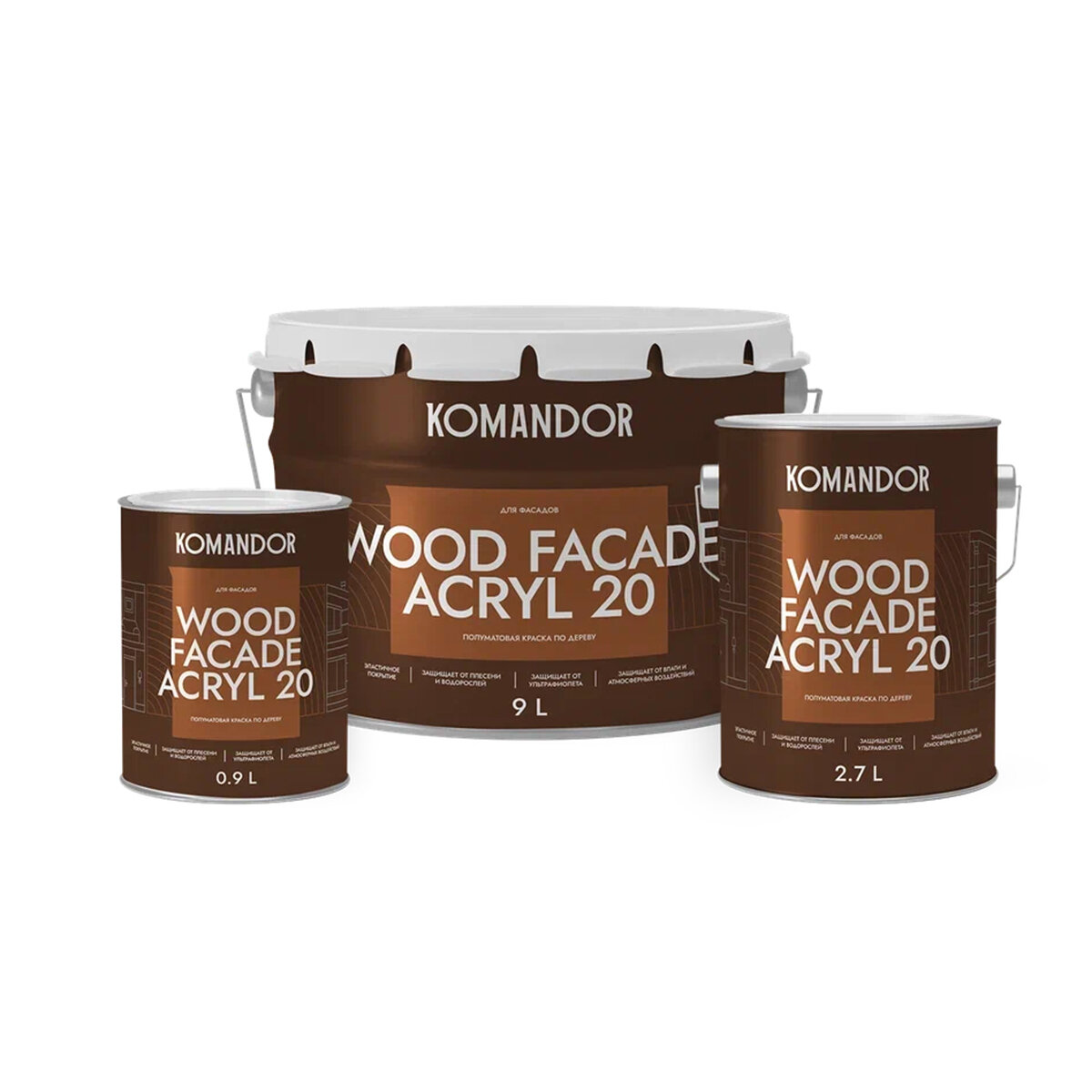 Краска для деревянных фасадов Komandor Wood Facade Acryl 20, полуматовая, база C, бесцветная, 0,9 л