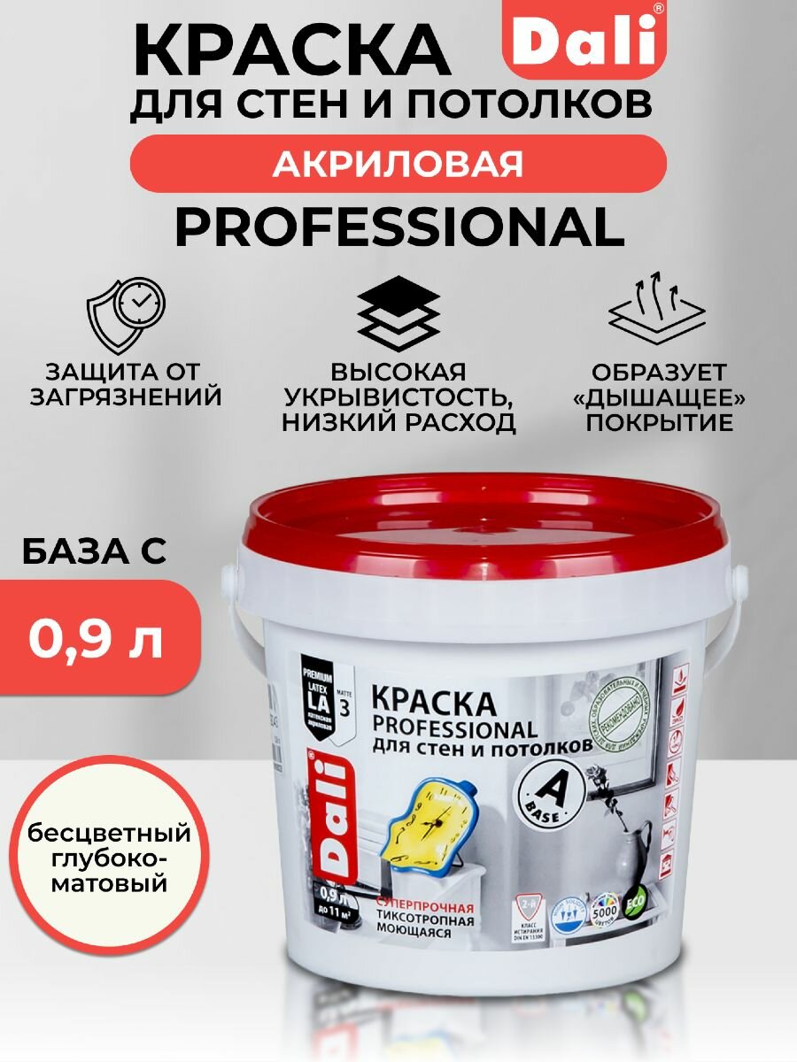 Краска для стен и потолков Dali Professional, акриловая, глубокоматовая, база C, бесцветная, 0,9 л