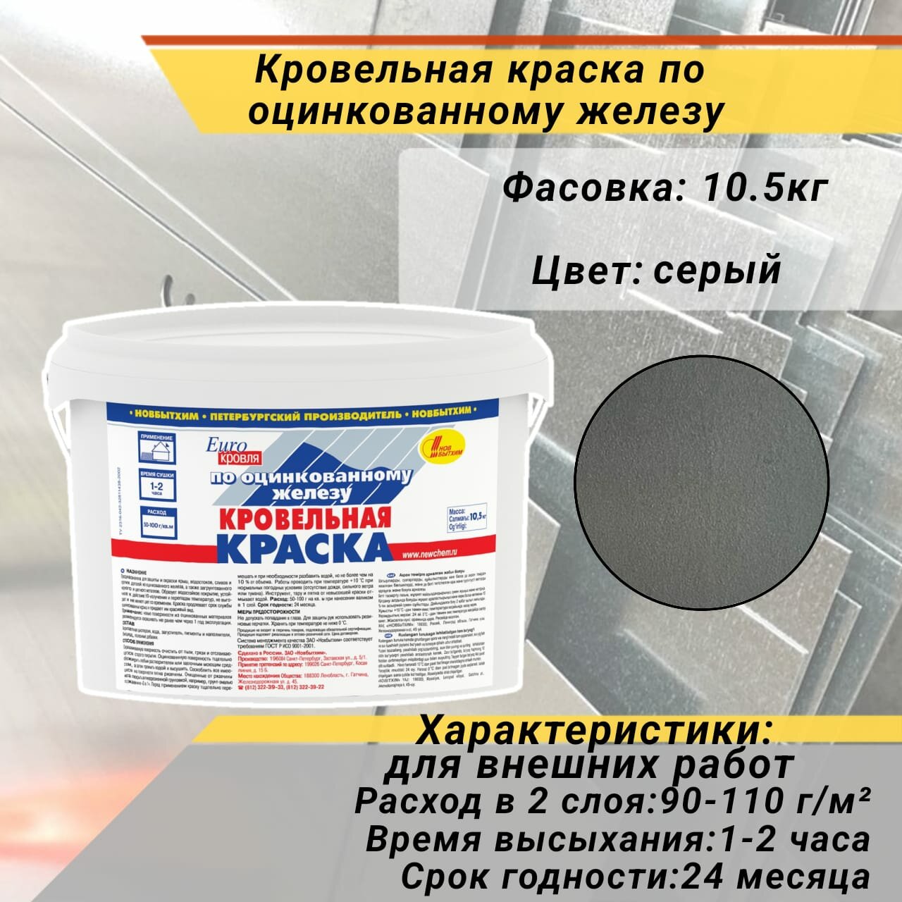 Купить Кровельная Краска Новбытхим 10.5кг Серая по Оцинкованному Железу.