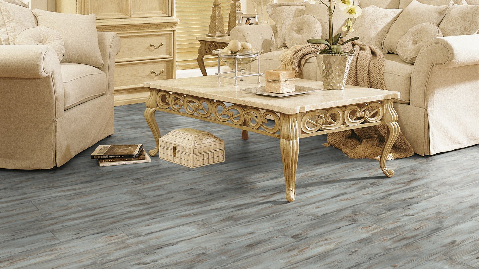 Выбрал вариант Kronotex Aqua Robusto. Интересный чёткий рисунок, что важно. Почитал отзывы, отмечают, что не выцветает со временем. Могу отметить, что он хорошо укладывается. На вид выглядит прочно. Но через месяц пользования могу сказать, что не продавливается под ногами и шкафами. Ногам комфортно ходить по ламинату |
