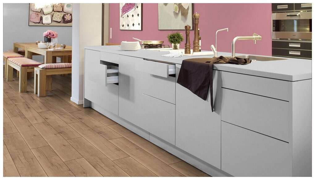 | Минусы: | Приобретал для ремонта ламинат Kronotex Exquisit Plus D3661 Дуб Монтмело Натуральный в зал, в другие комнаты использовал более бюджетный вариант Kastamonu. Укладывали на подложку "виброфлор". Не смотря на ровную поверхность скрипел в некоторых местах, скрип у бюджетного аналога отсутствует. Произошло затопление квартиры, ламинат в воде был около 5 часов, плюс потом высыхал. После высыхания все плашки изменили свою геометрическую форму. Края плашек разбухли, разошлись стыки. На Kastamonu ничего подобного не было. |