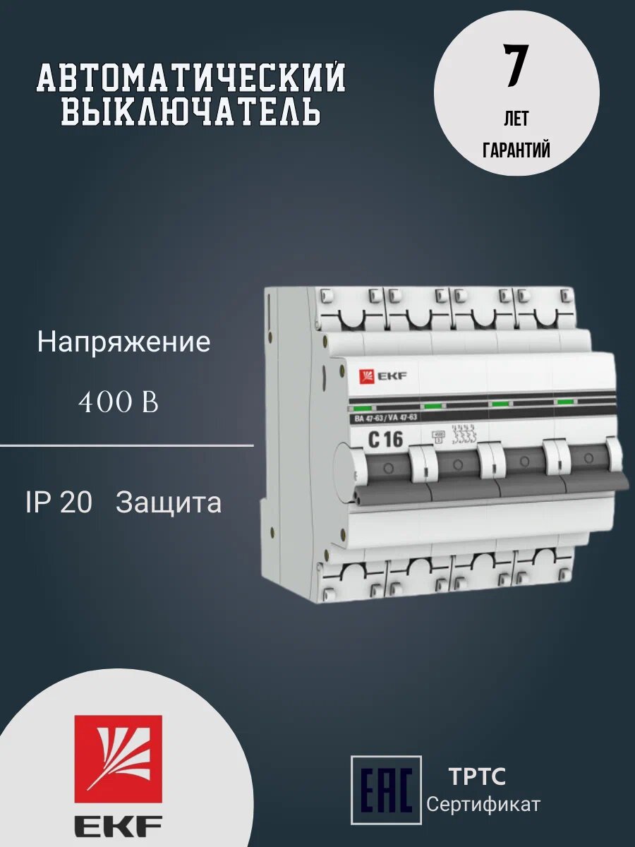 Выключатель автоматический модульный EKF 4п C 16А 4.5кА ВА 47-63 PROxima, mcb4763-4-16C-pro
