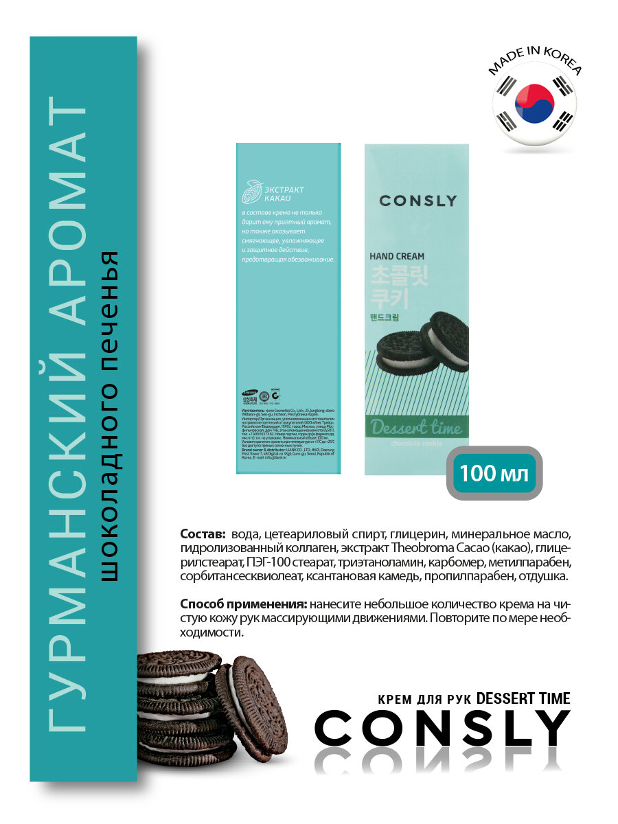 Consly Крем для рук Dessert Time с ароматом шоколадного печенья Dessert Time Chocolate Cookie Hand Cream, 100мл !сроки годности 05.2024!