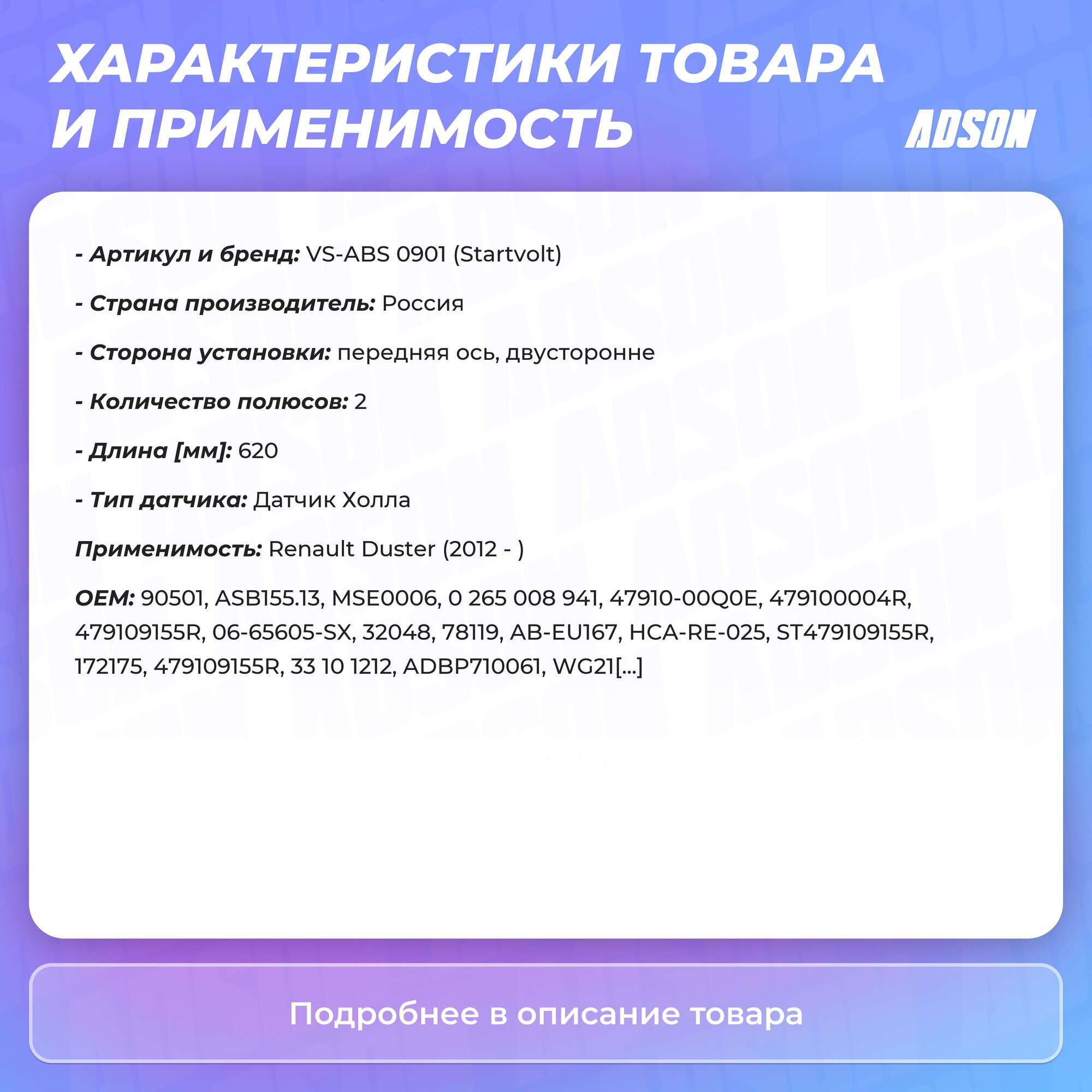 STARTVOLT VSABS0901 Датчик ABS для а/м Renault Duster (10-) пер. 4х2/4х4 (VS-ABS 0901)
