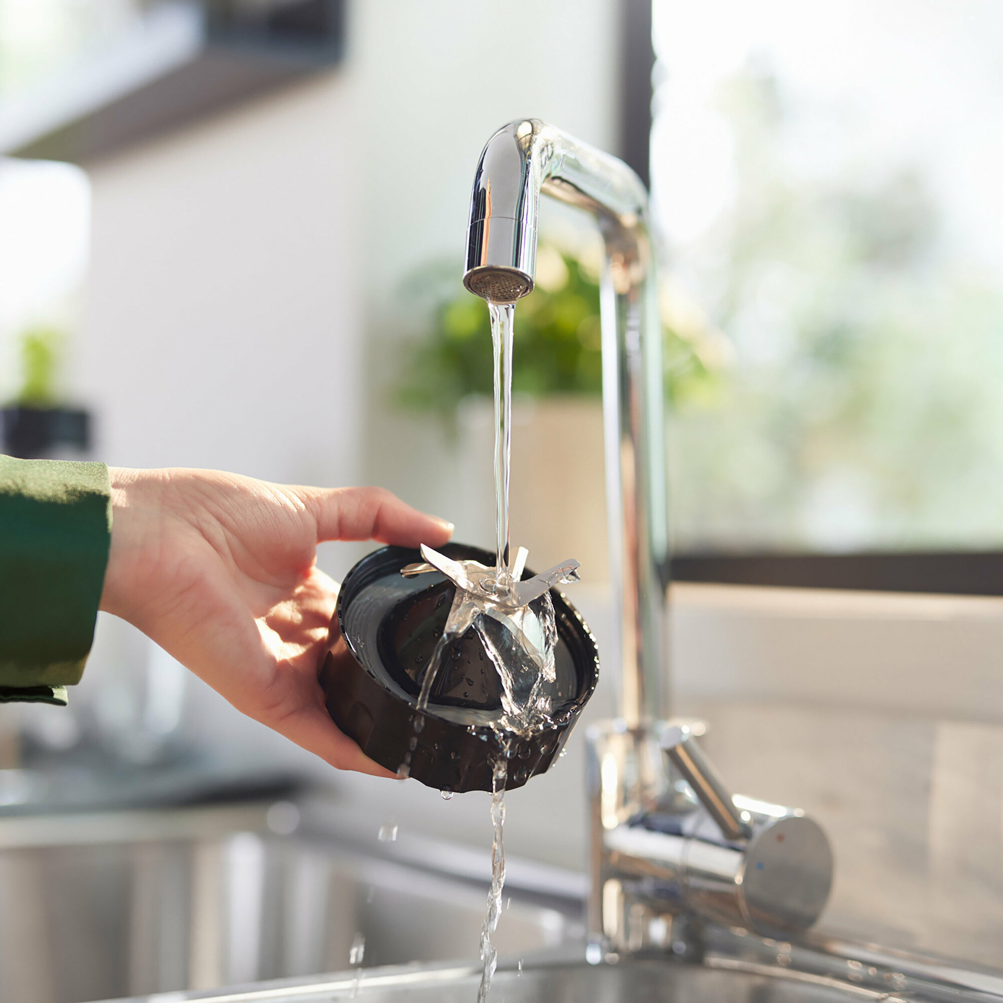 Чаша не впитывает запахи. Мыть удобно. Прорезиненные ножки оставляют блендер неподвижным даже при колке льда. Хороший блендер за свои деньги |