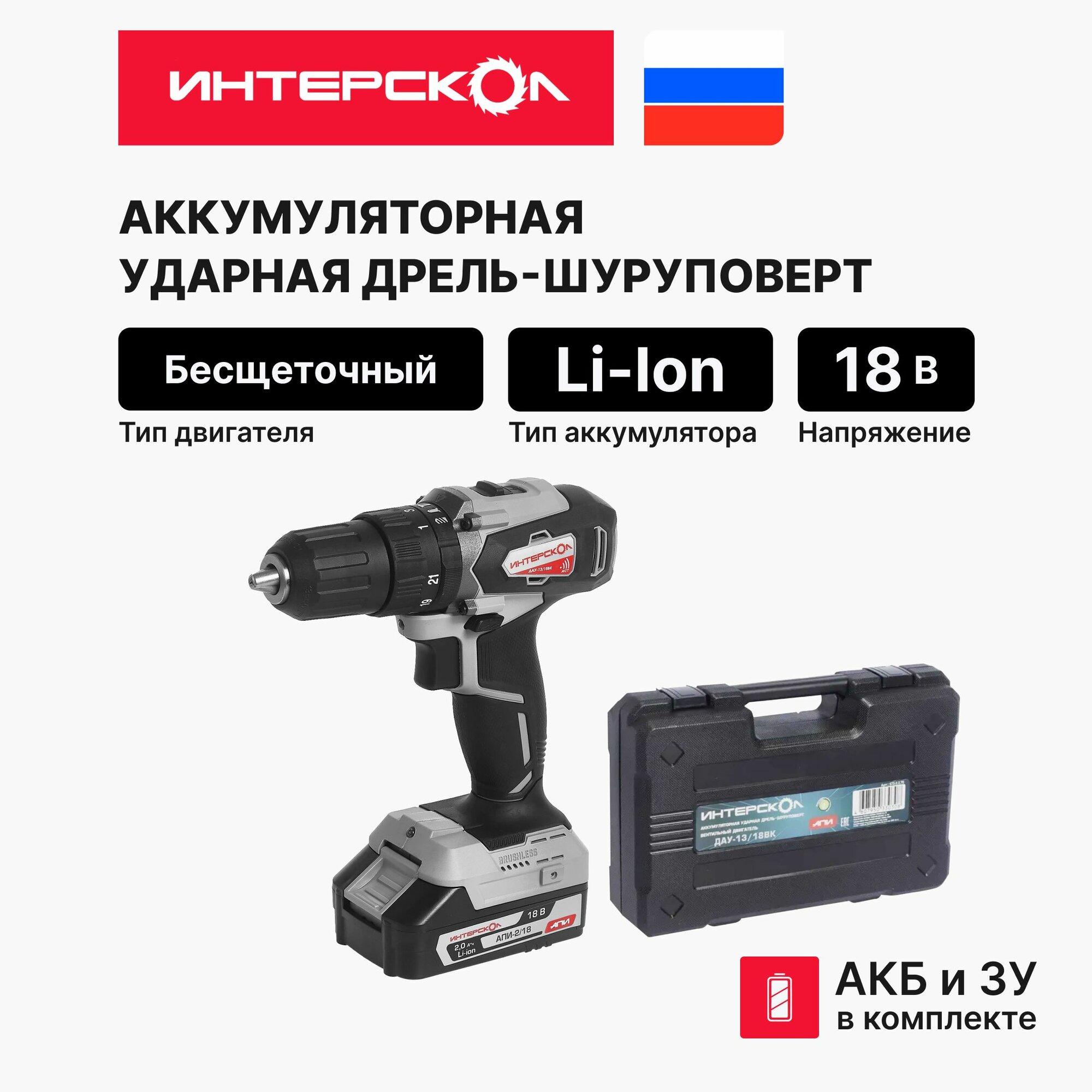 Бесщеточная аккумуляторная ударная дрель-шуруповерт ИНТЕРСКОЛ ДАУ-13/18ВК 573.2.2.70, кейс, АПИ, 2 АКБ, 2 Ач