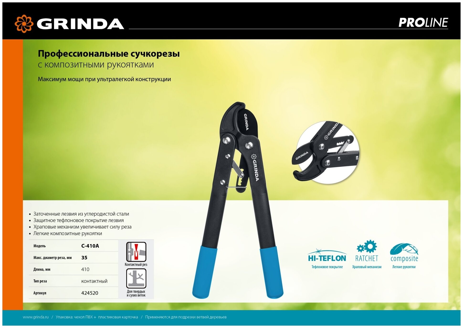 C-410A контактный сучкорез с композитными рукоятками, с храповым механизмом, GRINDA 424520